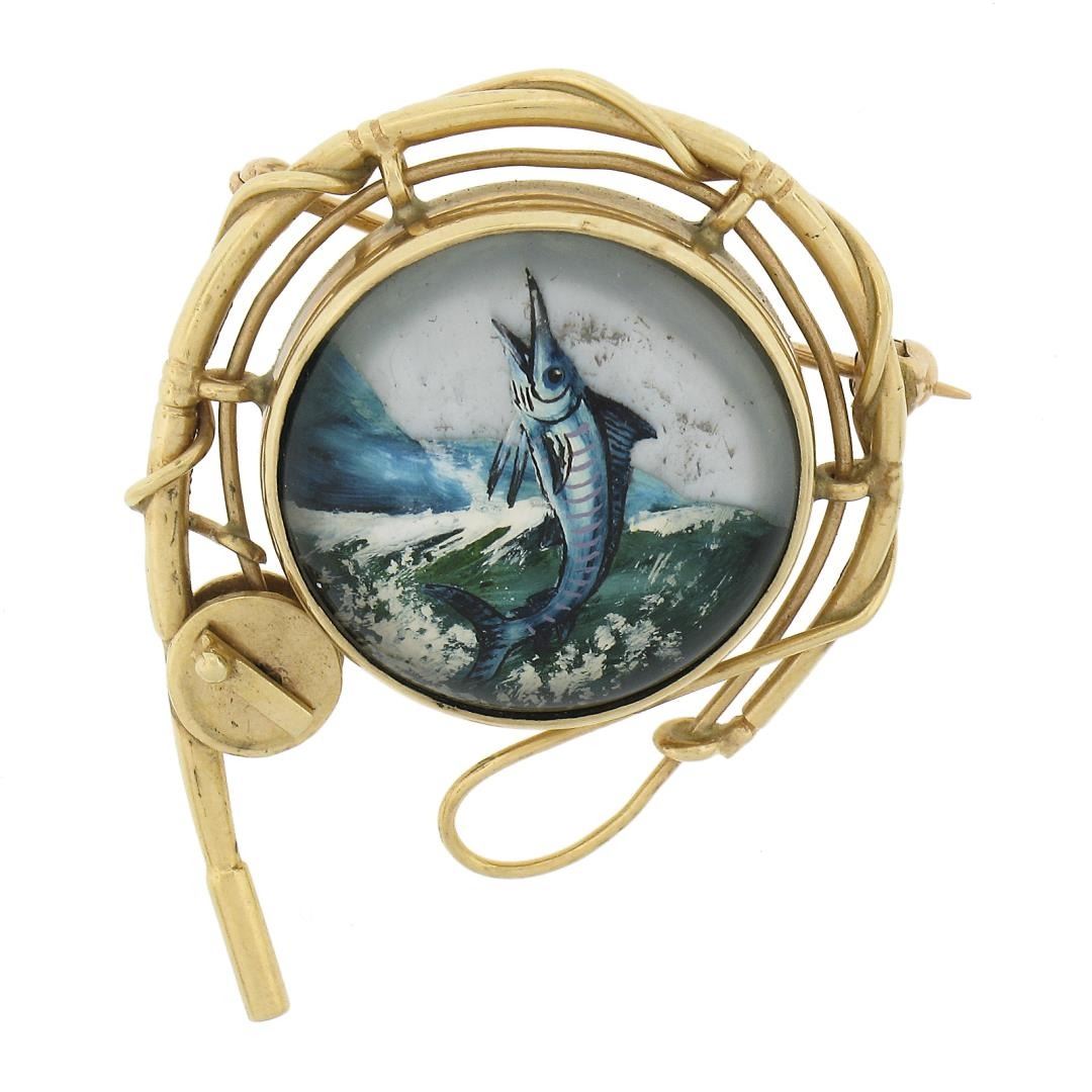 A solid 14k yellow gold fishing brooch, with intaglio painting scene. Measures 39.6x29mm and weighs a total of 11.21 grams.