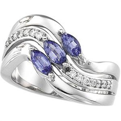14k White Gold Tanzanite and Diamond Ring. This lovely ring has a contemporary wavy gold design and features 3 oval Genuine TANZANITES with 14 round faceted Diamonds= 1/6 carat total weight.