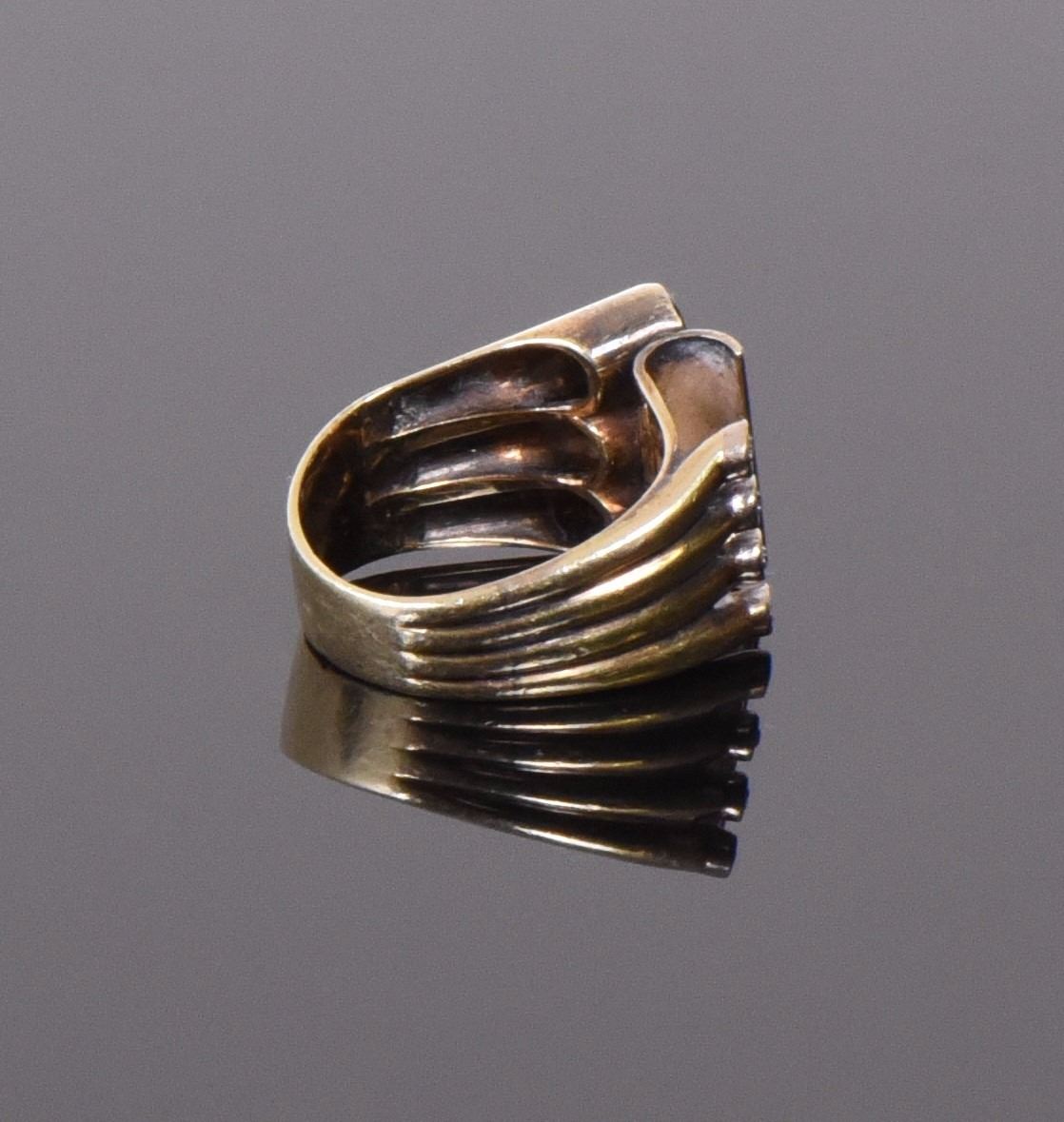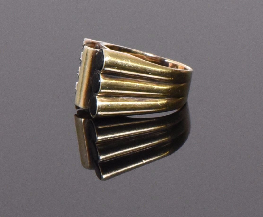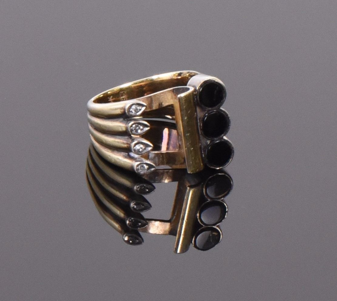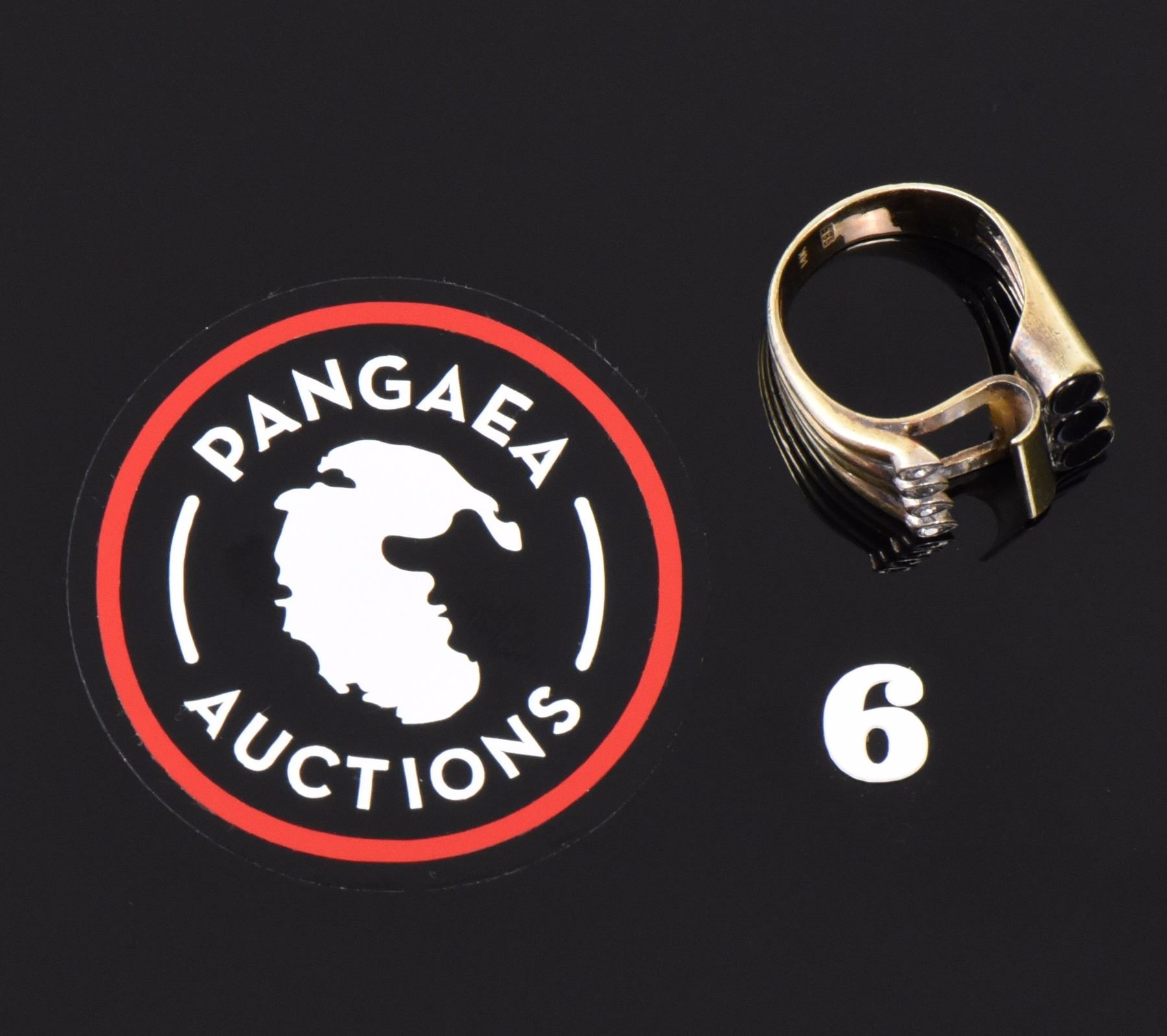 14k Gold Ring With Onyx And Diamonds. Weight: 0.31oz Ring Size: 6. Gold tested. Estimated more than 50 yrs. old. Gold, Tested Positive using Nitric Acid Chemical Scratch Test, Cloth Rub Test, Smell Test, and Magnet Test. Karat Stamp Markings. The reason Gold needs to be combined with other metals is that it is very difficult to make great designs with just pure Gold, which is very soft and malleable. Gold resists attack by individual acids, but a mixture of nitric acid and hydrochloric acid can dissolve it. It is insoluble in nitric acid, which dissolves silver and base metals, a property that has long been used to refine gold and to confirm the presence of gold in metallic objects. Gold is a precious metal used for coinage, jewelry, and other arts throughout recorded history. In the past, a gold standard was often implemented as a monetary policy within and between nations, but gold coins ceased to be minted as a circulating currency in the 1930s, and the world gold standard was abandoned for a fiat currency system after 1976. The historical value of gold was rooted in its relative rarity, easy handling and minting, easy smelting and fabrication, resistance to corrosion and other chemical reactions, and distinctive color. Many countries do not require their precious metal items to be stamped and therefore we test to ensure we accurately represent the product. Size: See Ruler Photo. (Photos Represent The Lot Condition, Pangaea Auctions)