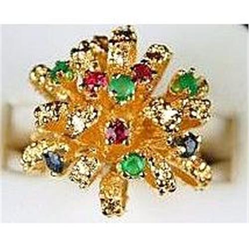This beautiful 14k Yellow Gold contemporary ring features Genuine RUBYS, EMERALDS, and SAPPHIRES. The ring is a Size 4 1/2 and it CAN be resized larger for you.