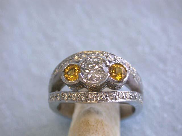 14k Gold Ring w/ Diamonds. This is a 14k Gold Ring w/ 0.50 carat Round Cut Diamonds in G color and VS clarity and 0.59 carat center Diamond in G color and VS clarity and 0.62 carat Sapphire. The size of this is 6.25 and weighs 11.55 grams.