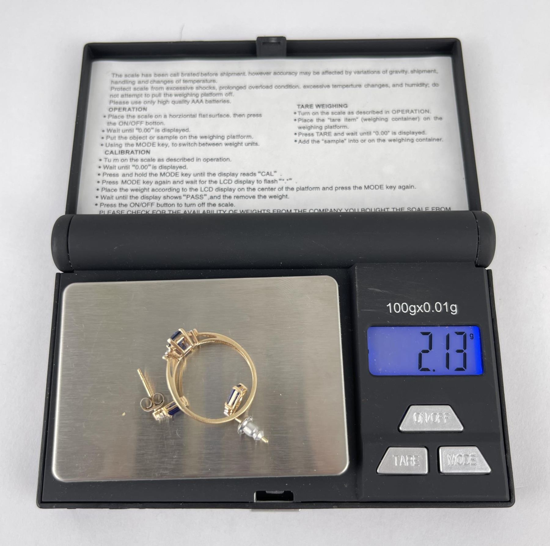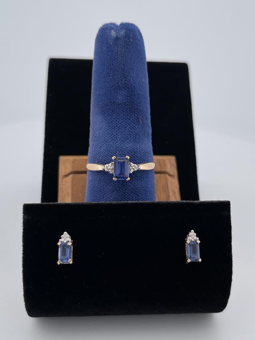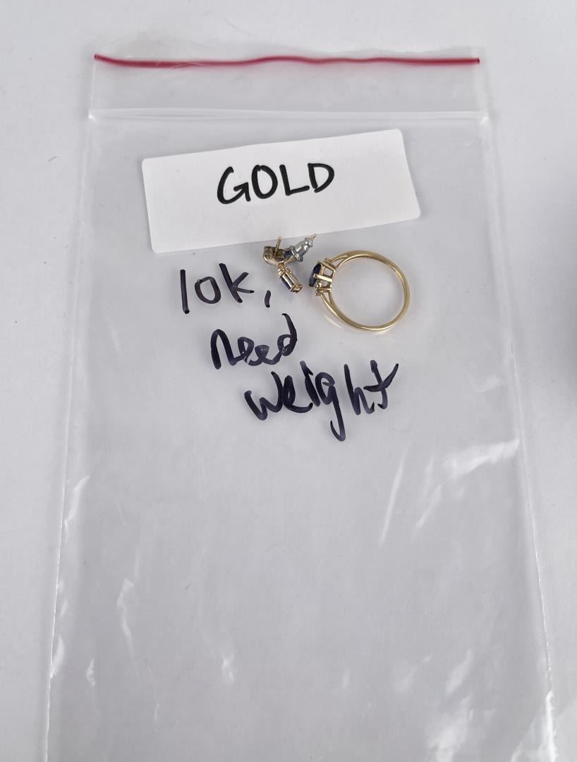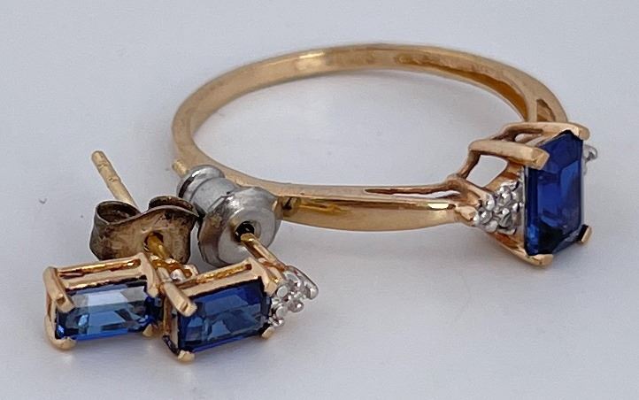 Very nice grouping. All are 14k Gold. Stones appear to be heated sapphire. 2.13 grams total weight.