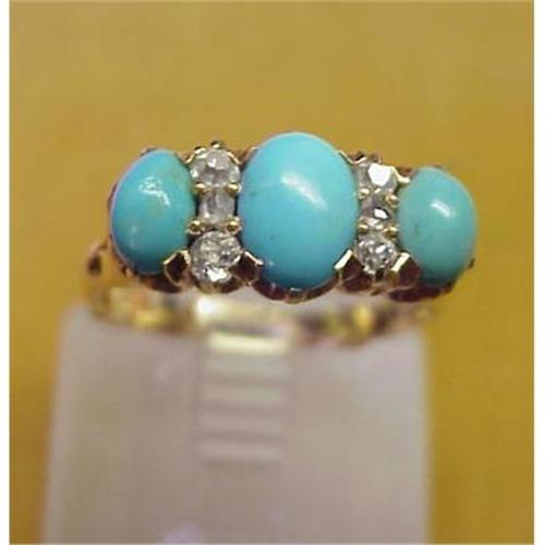 This is a gorgeous antique ring, adorned with 3 beautiful turquoise oval stones, center stone being larger and 6 diamonds, 3 on each side of the center stone.Beautiful "high" setting - This ring is fitted with "guard" size 8,and it can be removed ring,without guard it would probably fit large 8 1/2. made of 14k yellow gold,Please include 6.00 for shipping plus insurance.- Thank You for looking.