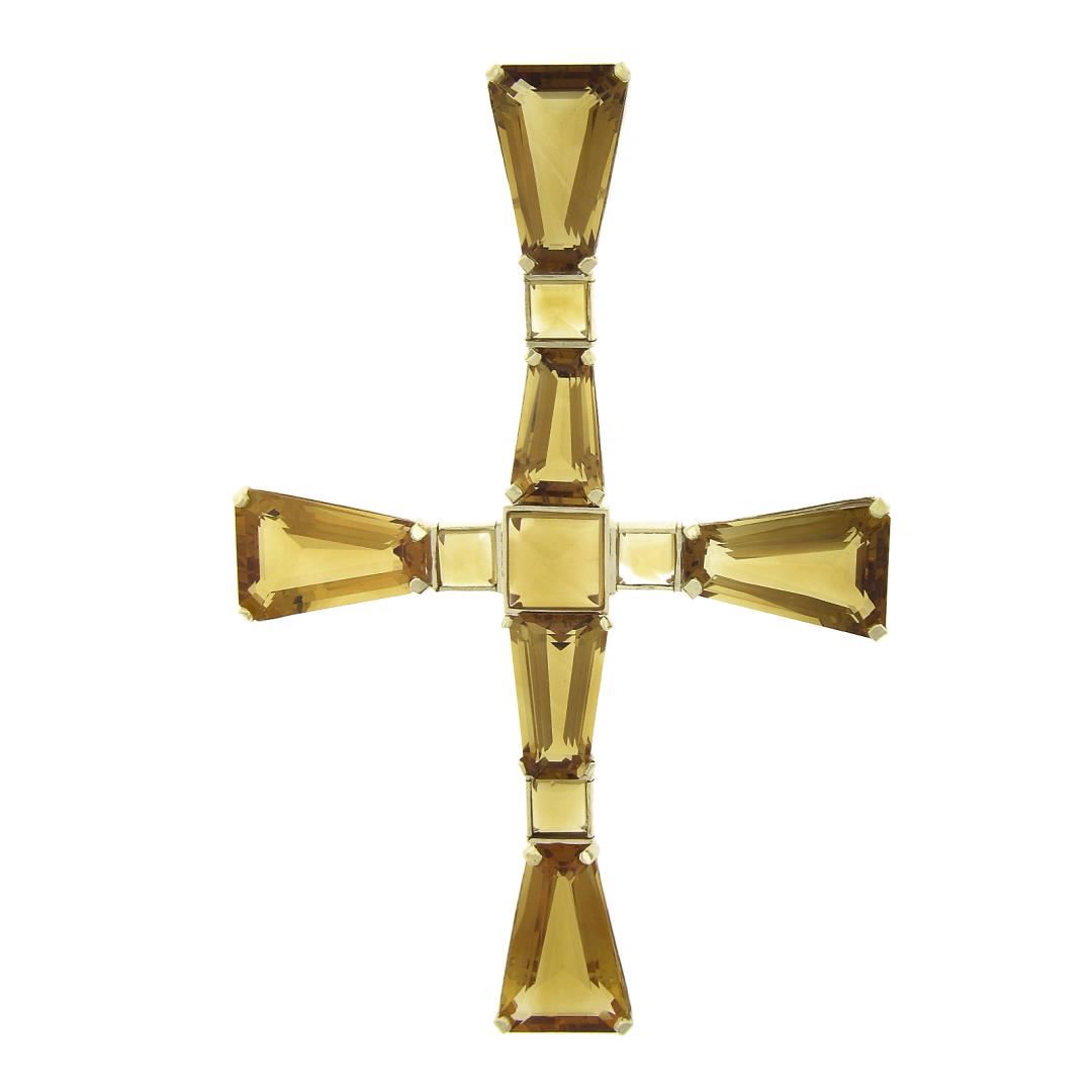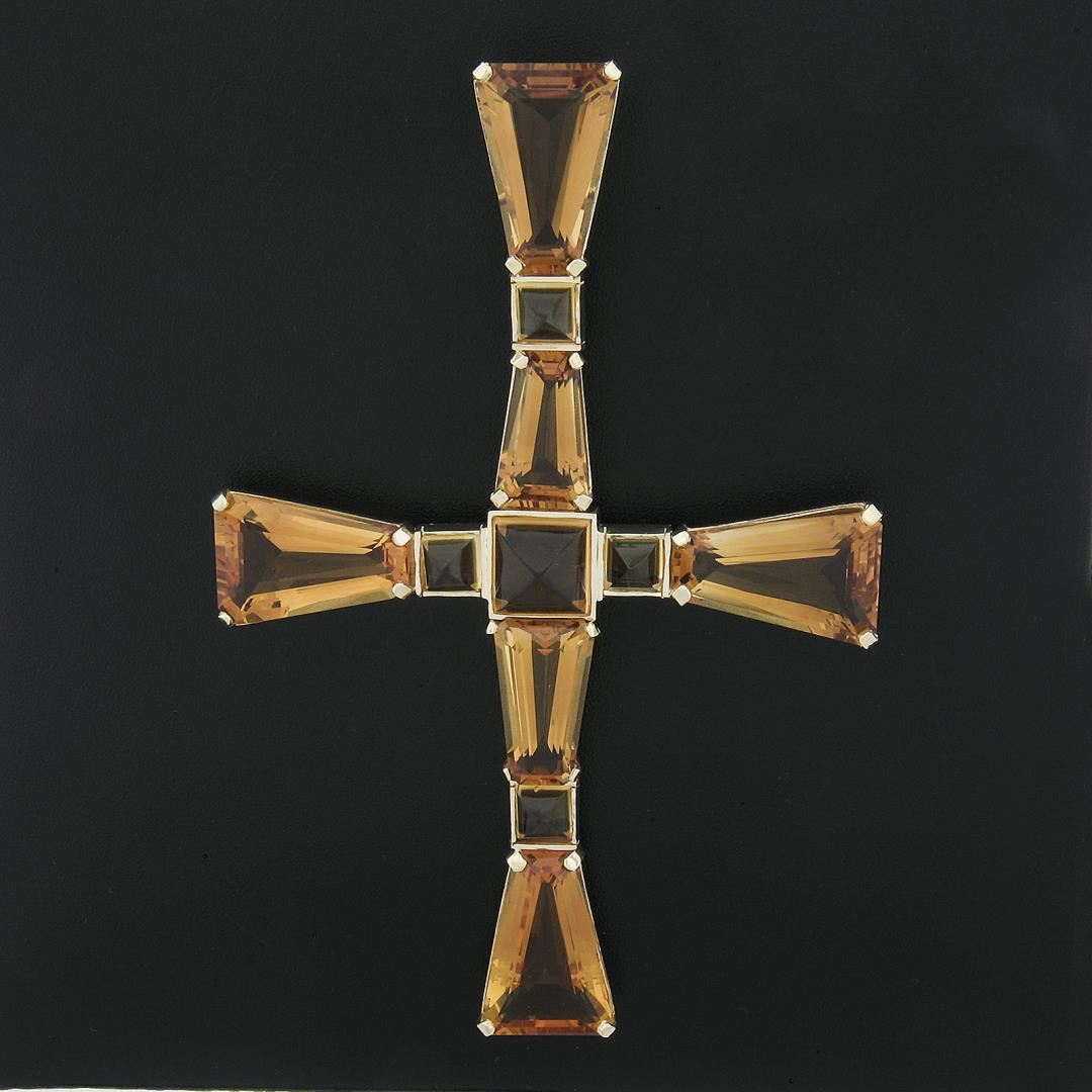 A solid 14k yellow gold large cross pendant, featuring 6 trapezoid cut natrual citrines (16.2x8.6mm to 20.3x13.5), and 5 sugarloaf cabochon cut natrual citrines (5.6x5.6mm to 9.6x9.6). The pendant weighs a total of 25.30 grams, measures 106.2x67.7mm including the bail, and the inside of the bail measures 9.2x5.4mm.