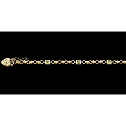 This 14k Yellow Gold Bracelet is referred to as a 'Victorian Gate Bracelet'. This one is quite unusual as it is accented by PERIDOTS. The clasp, of course, is Heart shape with a safety chain. This bracelet is 7.25" in length.