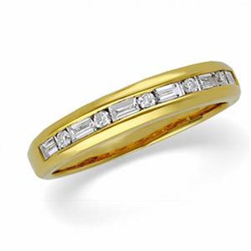 14k Yellow Gold Wedding Band, also called an Anniversary Band, with 6 Emerald Cut Diamonds alternating with 5 round Diamonds across the top. The Diamond Total Weight= .37 Carats! The Diamonds are set down into the band so that there are no prongs to catch on your clothing. The Diamonds are all well matched, in the 'SI' Quality Category and the 'I; Color Category. This beautiful Wedding Band is a Size 7 and it can be resized.