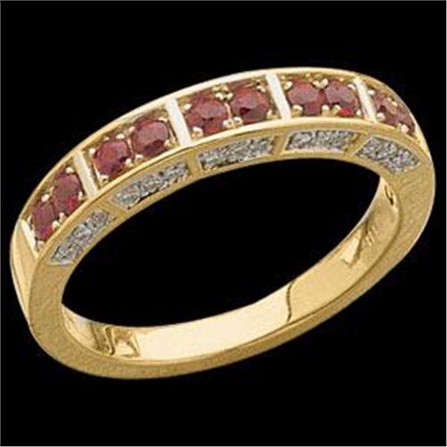 This beautiful and unusual Wedding Band is 14k Yellow Gold and it features 10 Genuine RUBYS set across the top. The Ruby Total Weight = .40 CARATS! There are 15 'sparkling' Diamonds set each SIDE of the Rubys. The Diamond Total Weight = .15 Carats. This Wedding Band is 3.5MM wide, and it is a Size 6. I can resize it for you.