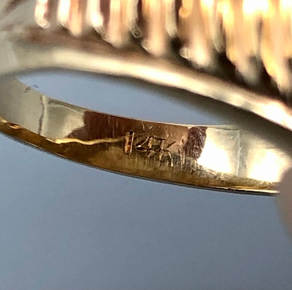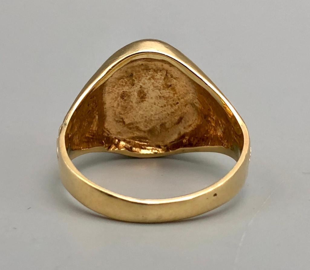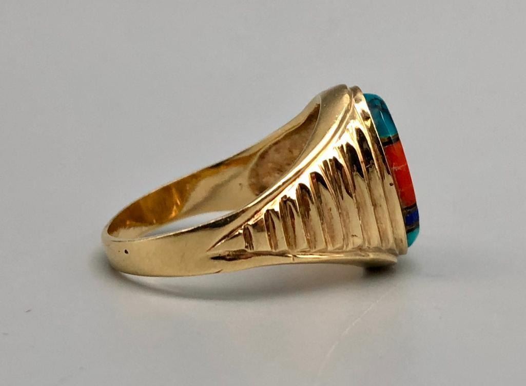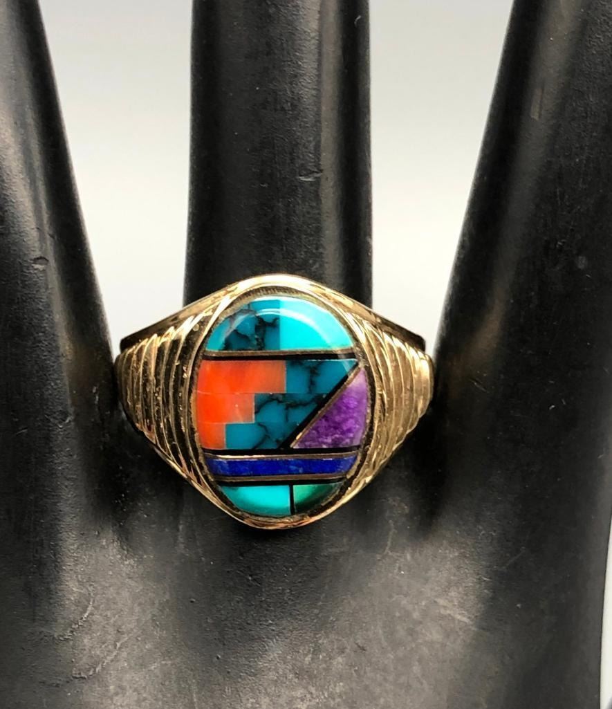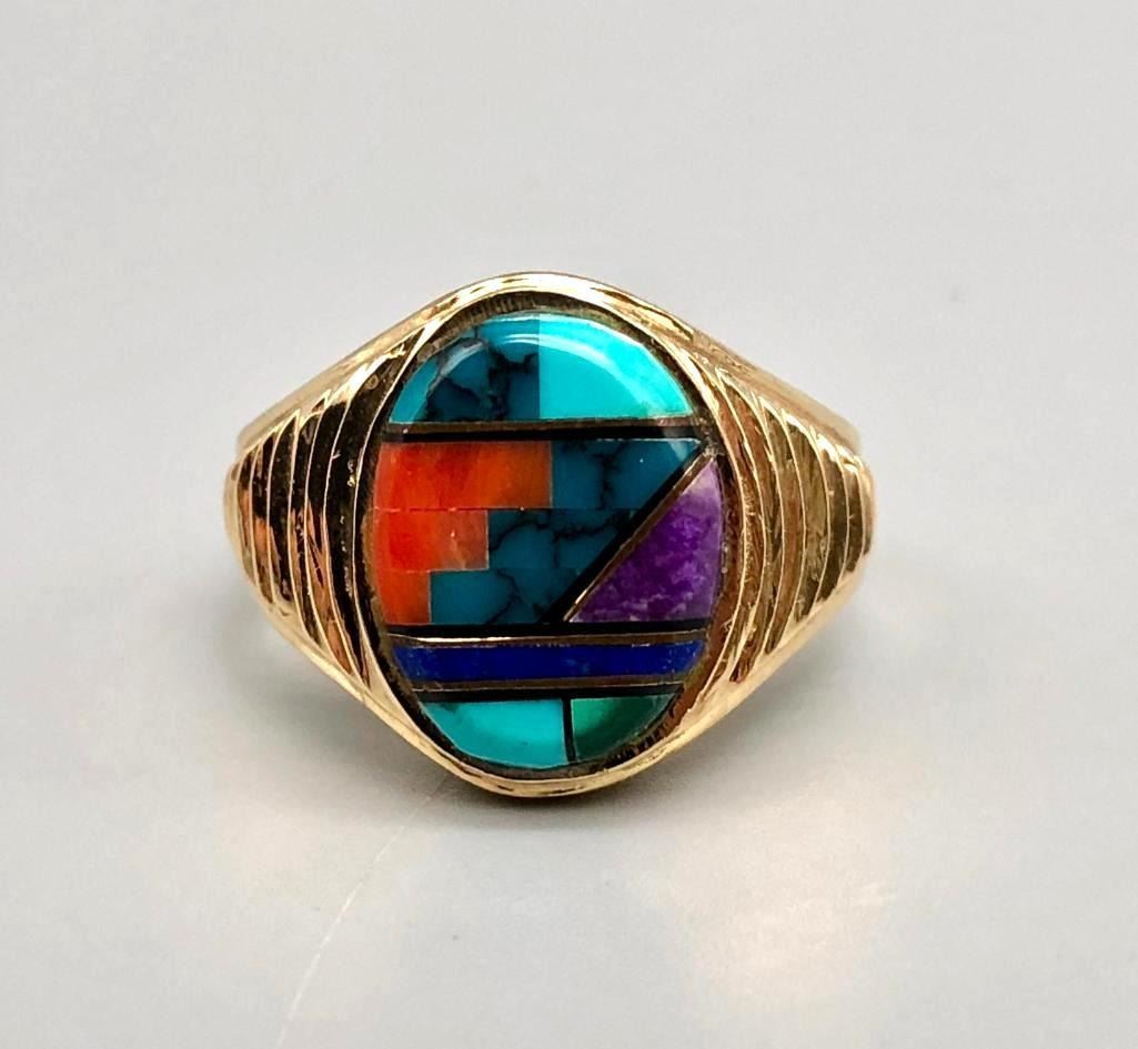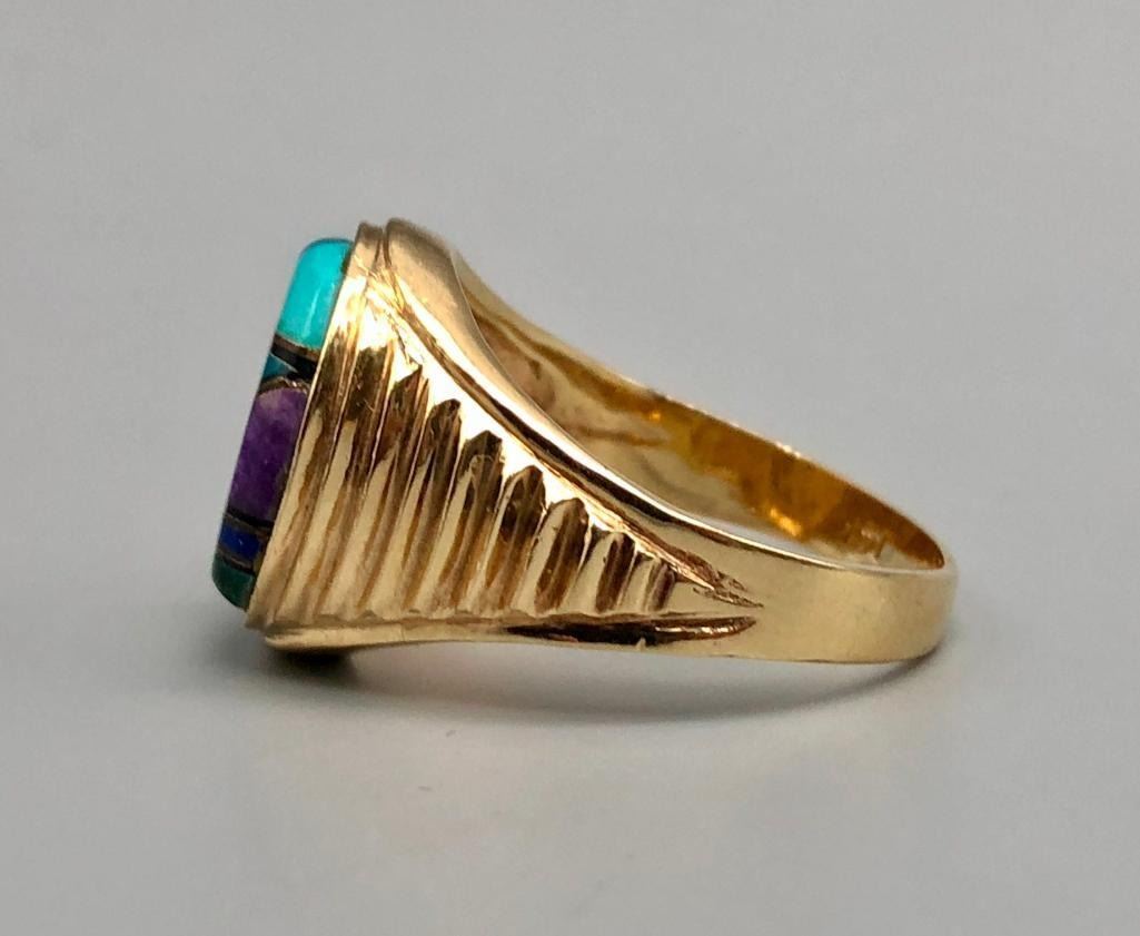 Presented for sale in this lot is a 14k gold and multi-stone inlay ring. This is a great ring that has a nice, flush inlay setting of turquoise, coral, sugilite and lapis, highlighted with fine gold and onyx lines. It is on a stamped 14k gold band with textured sides. MAKER: Unmarked. APPROX AGE: Fairly modern. SIZE: Fits a size 10. 5/8 inches wide. Weighs 11 grams. CONDITION: Good for its age, normal wear expected. Please look closely at the pictures as they are an important part of our description and are hereby incorporated into the description, specifically with regards to condition. SHIPPING: There will be a $5 handling / packaging fee for shipping this lot. The actual cost of postage will be added on top of that. BUY IT NOW: If you would like to buy this item now, without waiting for the auction day to bid on it, we do offer this option (which is available up to 48 hours before the actual auction starts). The “Buy it Now†price is the high estimate of this lot (plus applicable fees and the Buyer's premium is discounted to 10% when using the Buy it Now option). If you would like to exercise this option, you must contact us by email (or phone as long as you talk to someone live). Reference this lot number and your intention to "Buy it Now."