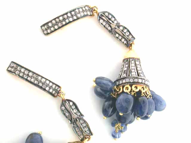 14k Gold and Silver Earrings. The earrings have Diamonds - 1.48 carats and Sapphires - 29.2 carats. Its Length - approximately 2 inches long and Weight - 14.60 grams.