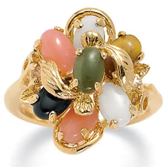 Two prong-set oval-cut Coral each measure 6 mm wide x 4 mm long, One prong-set oval-cut Jade measures 6 mm wide x 4 mm long, Two prong-set oval-cut Opal each measure 6 mm wide x 4 mm longOne prong-set oval-cut Tiger's Eye measures 6 mm wide x 4 mm long, One prong-set oval-cut Onyx measures 6 mm wide x 4 mm long, Metal: Gold Overlay, Finish: High polishMetal weight: 5.3 grams, Ring setting dimensions: 18 mm wide X 19 mm long, Band dimensions: 1.9 mm wide. Ring Size 7