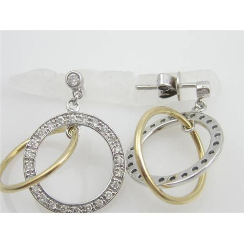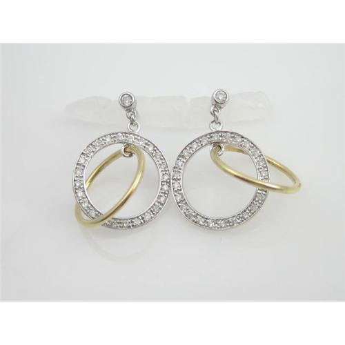 I guarantee that this pair of earrings WILL be your FAVORITE! They are 14k White Gold with a round 14k Yellow Gold circle that moves inside a 14k White Gold Circle set all around with Diamonds! There is also a Diamond set at the top. The effect is that every time you move your head the circles move and sparkle! Each circle is 5/8" across. The Diamonds are all FINE 'VS' Quality and FINE 'F' Color and the Diamond Total Weight = .45 Carats!