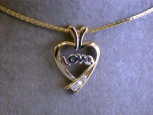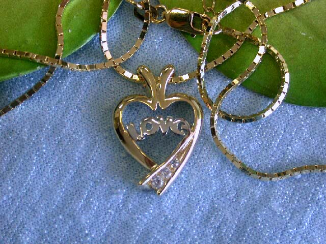 14k Yellow GoldNecklace. It has a heart designed pendant w/ Cubic Zirconium. The length is 16 inches long and weighs 6.2 grams.