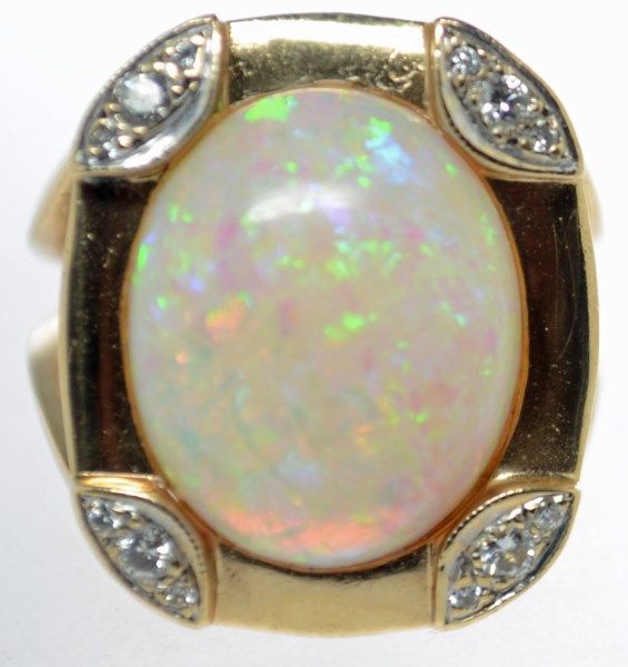 This ring could be worn by a woman or confident male! It is huge. Marked 14K, Large opal with fabulous play of color, diamond accents at four corners of the ring. Opal measures 3/4" x 1/2". Rings weighs 17.3 grams! Pre-owned and nice Estimated at $1300.00 - 1500.00
