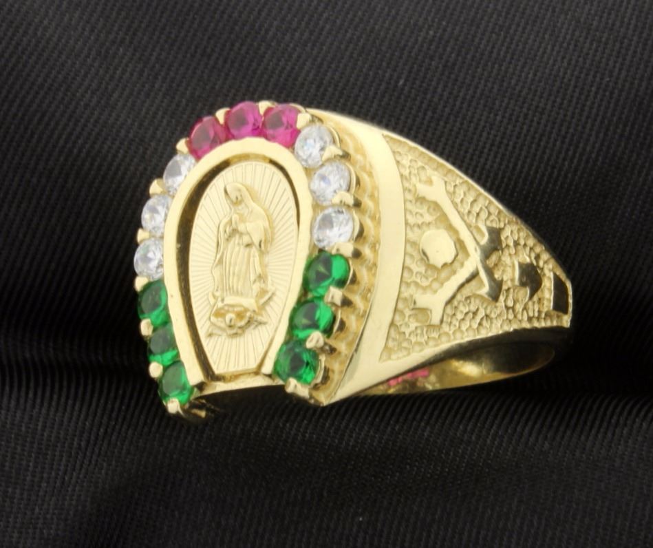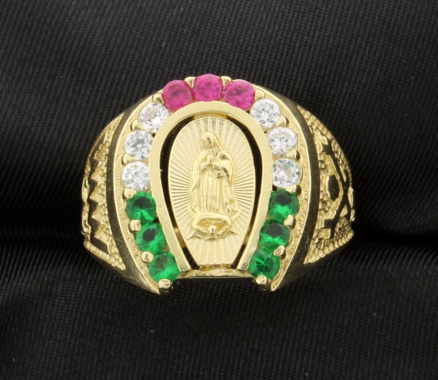 14k "Our Lady" ring with synthetic ruby, emeralds, and CZ white stones. Size 10 1/2. 7.4gr.