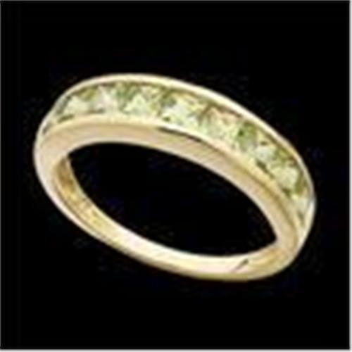 It is a 'Brand New' 14k Yellow Gold Band Style ring featuring a row of 10 Channel Set Genuine Princess Cut Peridots. This ring is a size 7 but other sizes are available. Since the Peridots are Channel Set there are no prongs to catch on your clothing. This is a VERY well made piece of jewelry and I HIGHLY recommend it to you.