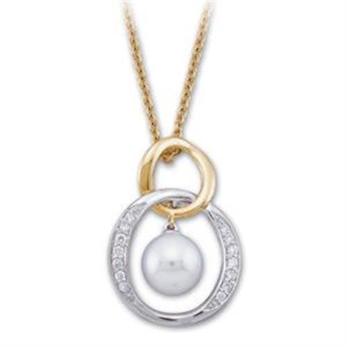 14k Yellow and White Gold Pendant featuring a beautiful 6.5mm AKOYA PEARL dangling within a circle. This White Gold circle is set with sparkling Diamonds, and dangles from a Yellow Gold circle. This stunning Pearl and Diamond Pendant is suspended from a 14k Yellow Gold Chain.