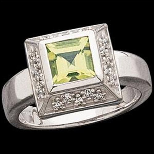 14k White Gold ring featuring a PRINCESS CUT PERIDOT = .75 CARATS surrounded by Diamonds. The Diamond Total Weight = .33 Carats! This beautiful ring is a size 6 and I can resize it for you.