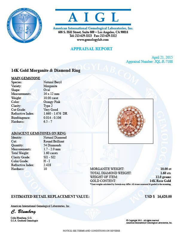 All jewelry items sold by JewelMonster are evaluated by third party appraisal firms where certified GIA Gemologists evaluate the weight, size, and grade of gemstone and/or metal to determine the replacement value of the item. Please be advised that all appraisals are done for insurance purposes only and do not determine the actual value of the jewelry on auction. The appraisals are done for sole purpose of protecting the Buyer in the event of damage or loss of purchased jewelry items from JewelMonster. JewelMonster is not responsible for the opinions and appraisals of any third party appraisal firms and their experts.