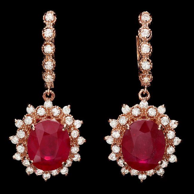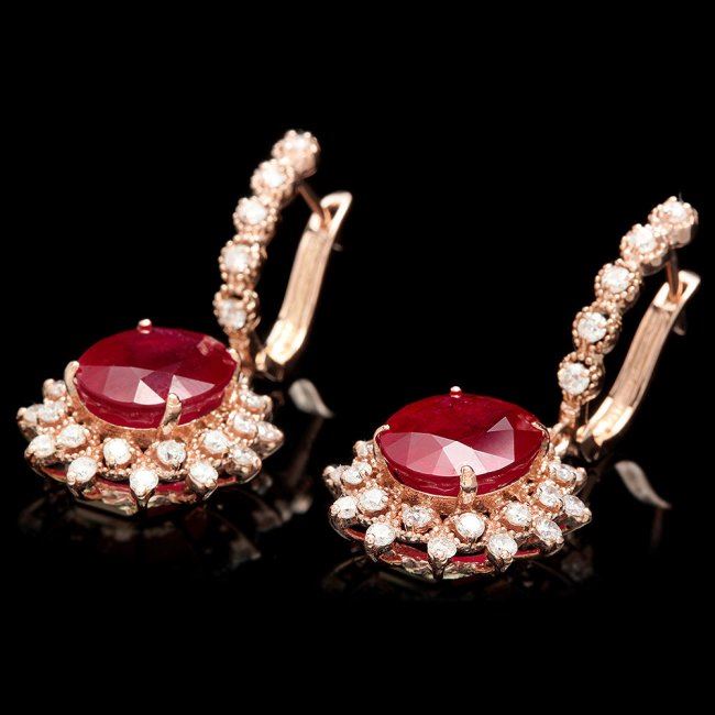 Retail: $17,500.00 ****** 14k Rose 13.50ct Ruby 1.70ct Diamond Earrings ****** Metal: 14k Solid Rose Gold / Total Item Weight: 10.5 grams / Country Made: United States / / Main Stone: Ruby / Color: Red / Carat Total Weight: 13.50 / Treatment: Filling / Clarity: Type 2 / Cut: Very Good / / Secondary Stone: Diamond / Carat Total Weight: 1.70 / Treatment: None / Color Grade: G - H / Clarity: SI1 - SI2 / Cut: Very Good /