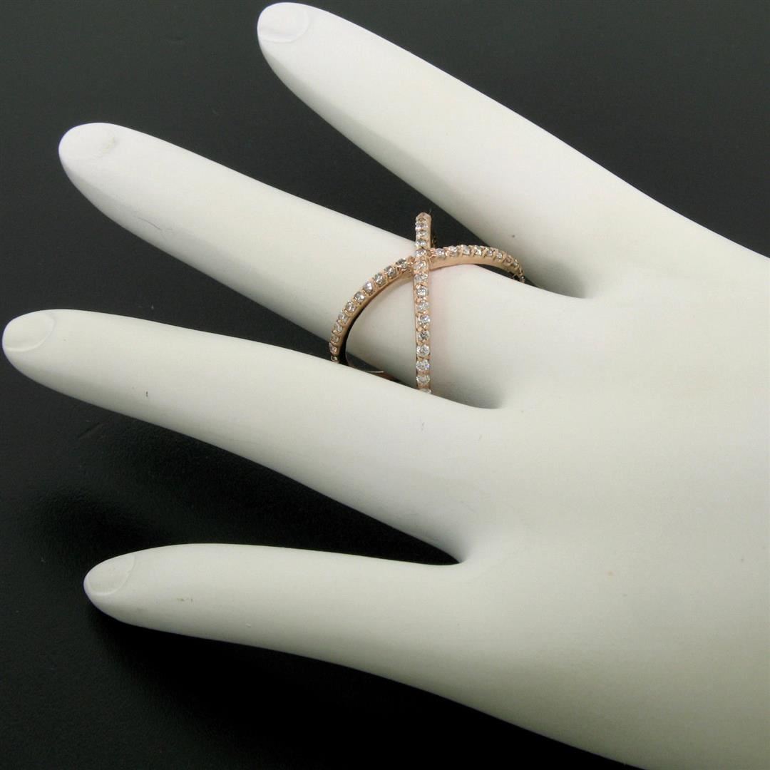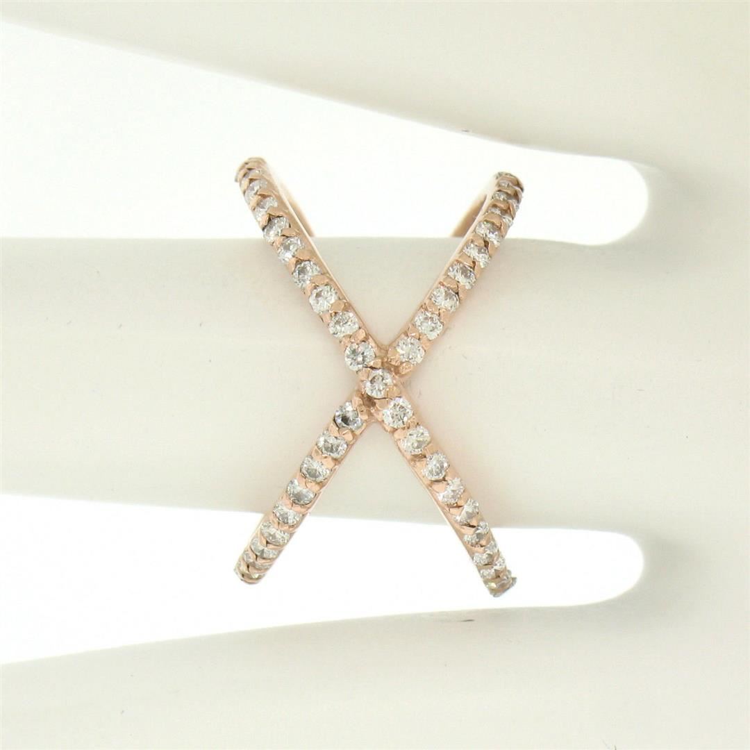 One NEW 14k Rose Gold 0.50ctw 45 Round Brilliant Diamond Simple X Ex Cross Band Ring. Item Details: Material: 14k Solid Rose Gold, Weight: 3.0 Grams, Stone(s): (45) Natural Genuine Diamonds - Round Brilliant Cut - Prong Set - G Color - VS2 Clarity, Total Carat Weight: 0.50, Ring Size: 5.75 (We can custom size this ring.), Ring Width: 13.60mm, Ring Height: 2.50mm rise off the finger, Condition: New w/o Tag