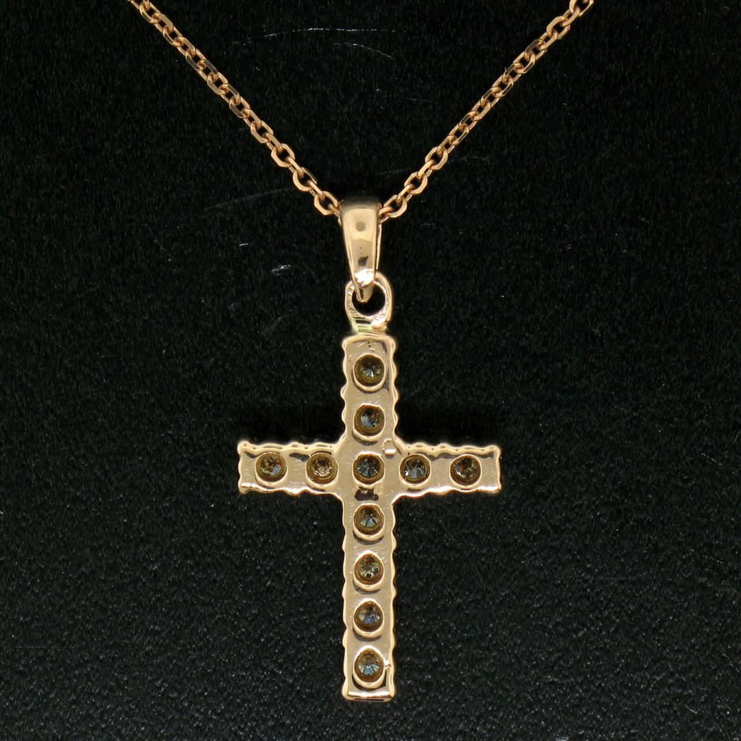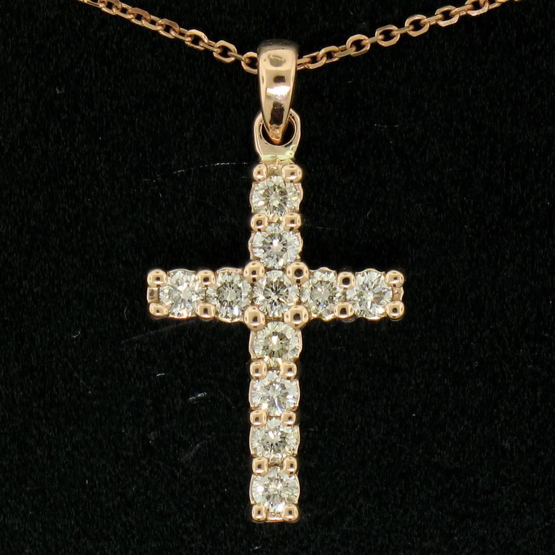 One 14k Rose Gold 0.75ctw Round Brilliant Diamond Petite Cross Pendant w/ 16" Chain. Item Details: Material: 14k Solid Rose Gold, Weight: 4.0 Grams, Stone(s): (11) Natural Genuine Diamonds - Round Brilliant Cut - Shared Prong Set - VS2 Clarity - H/I Color, Total Carat Weight: 0.75, Chain Type: Fine Cable Link, Chain Length: 16 Inches, Clasp: Lobster Claw, Width: 13.74mm, Height (w/ Bail): 26.12mm, Height (w/o Bail): 22.29mm, Thickness: 3.74mm, Condition: New w/o Tag