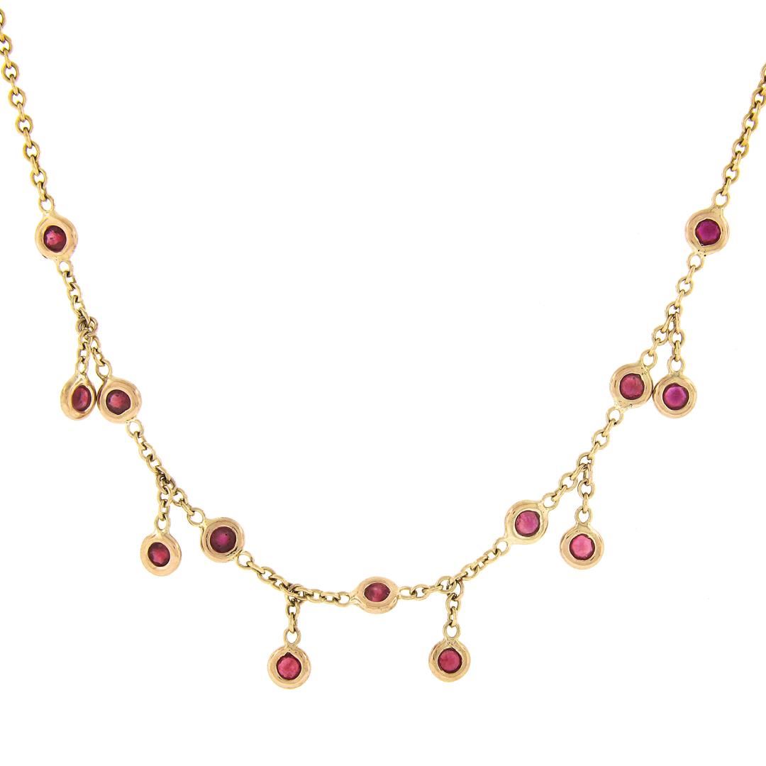 A solid 14k rose gold link necklace, with 13 round cut natural rubies (2.1mm each - 0.80ctw). It weighs a total of 4.09 grams, measures 3.9mm wide, and measures adjustable from 14 to 16.5 inches in length.