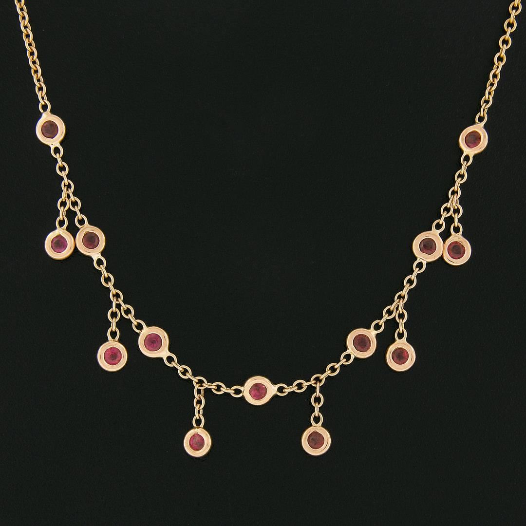 A solid 14k rose gold link necklace, with 13 round cut natural rubies (2.1mm each - 0.80ctw). It weighs a total of 4.09 grams, measures 3.9mm wide, and measures adjustable from 14 to 16.5 inches in length.