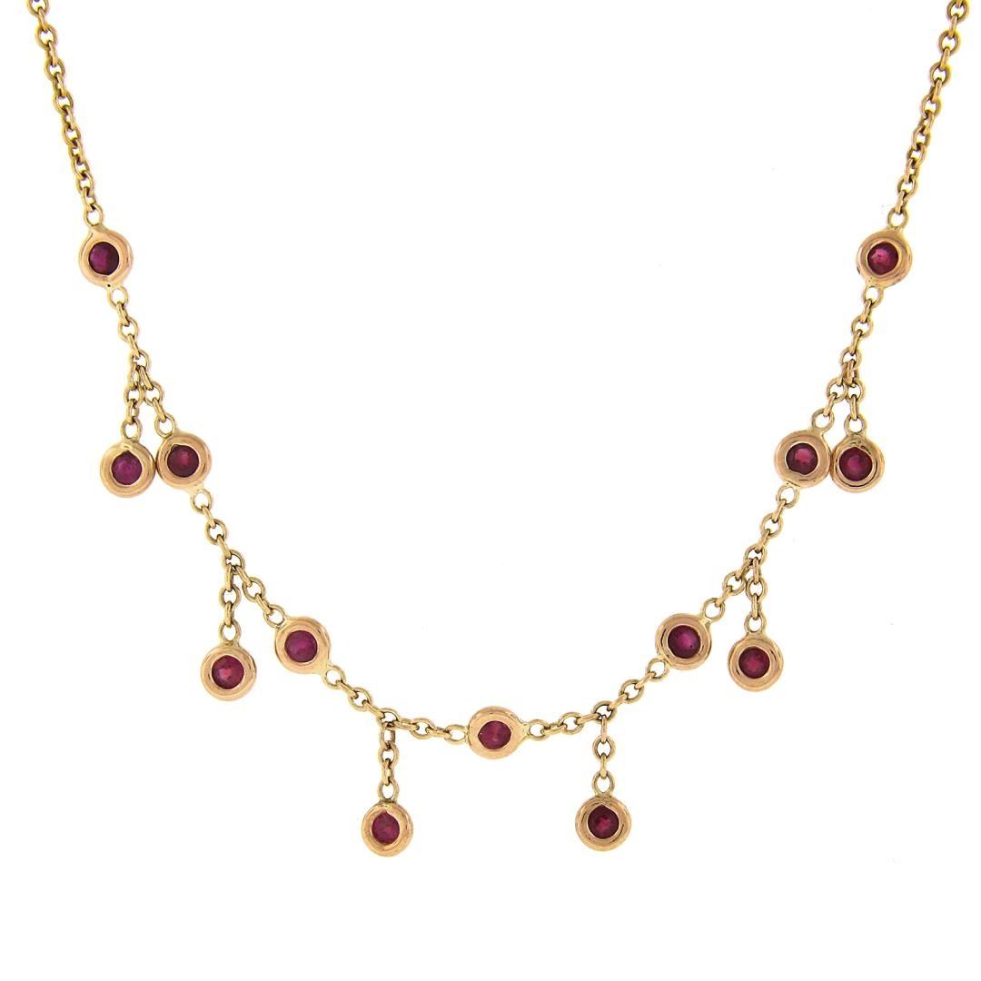 A solid 14k rose gold link necklace, with 13 round cut natural rubies (2.1mm each - 0.80ctw). It weighs a total of 4.09 grams, measures 3.9mm wide, and measures adjustable from 14 to 16.5 inches in length.