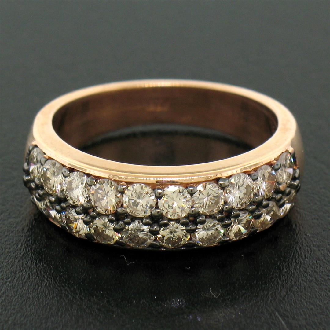 This brand new, custom made, dual row diamond band ring is crafted in solid 14k rose gold. This beautiful ring features two rows of 10 round brilliant cut, prong set, and very well matched fancy light champagne diamonds. The diamonds total exactly 1.10 carats and the prongs in which they are set are a gorgeously contrasting black rhodium. Each diamond in this ring is remarkably brilliant and fiery. The combination of colors found in the light champagne diamonds, the rose gold, and black rhodium prongs make for a beautiful and unique custom made piece. Enjoy!