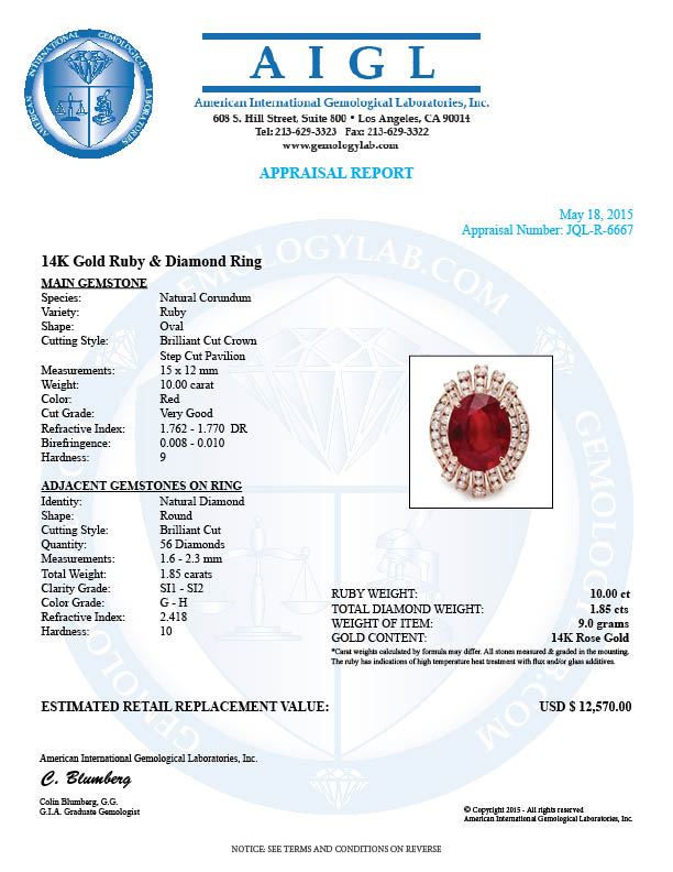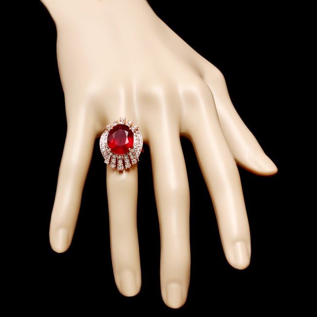 Retail: $12,450.00 ****** 14k Rose Gold 10.00ct Ruby 1.85ct Diamond Ring ****** Metal: 14k Solid Rose Gold / Size: 7 / Total Item Weight: 9.0 grams / Country Made: United States / / Main Stone: Ruby / Color: Red / Carat Total Weight: 10.00 / Treatment: Filling / Clarity: Type 2 / Cut: Very Good / / Secondary Stone: Diamond / Carat Total Weight: 1.85 / Treatment: None / Color Grade: G - H / Clarity: SI1 - SI2 / Cut: Very Good /