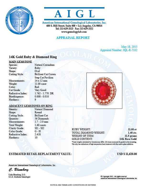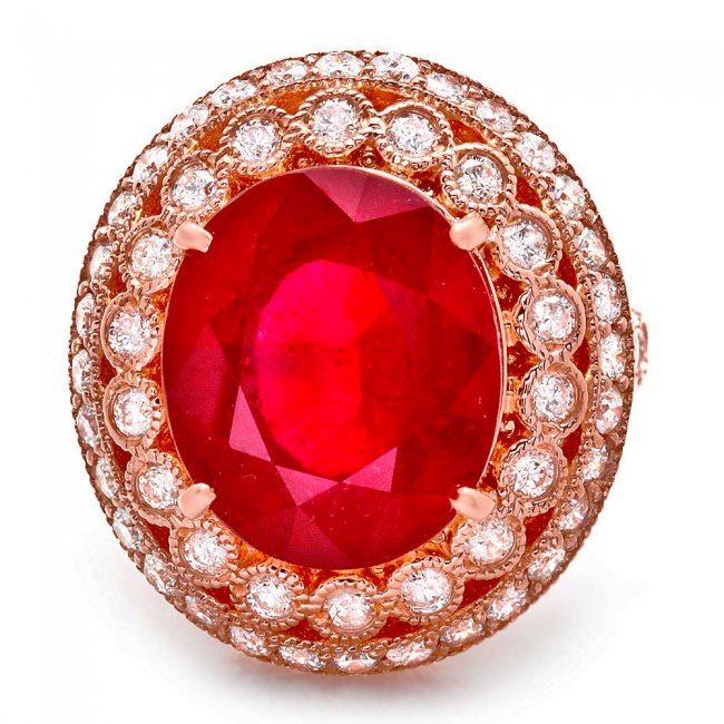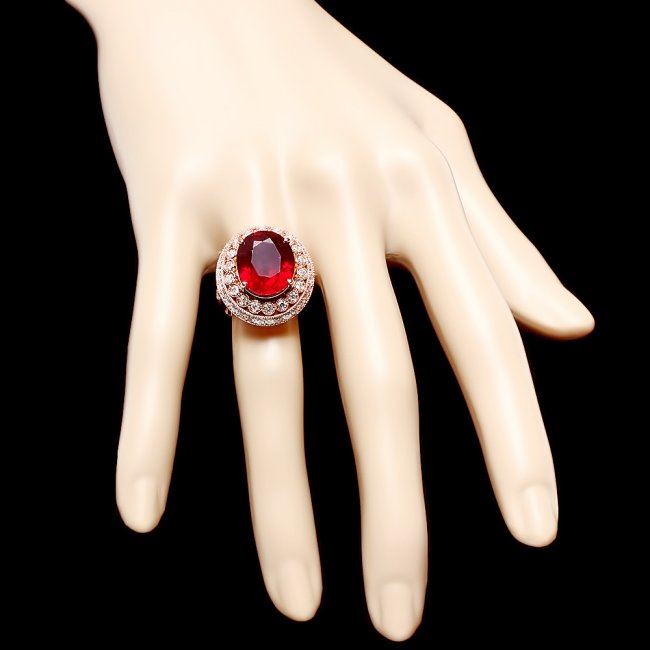 Retail: $11,500.00 ****** 14k Rose Gold 11.00ct Ruby 1.40ct Diamond Ring ****** Metal: 14k Solid Rose Gold / Size: 6.75 / Total Item Weight: 11.5 grams / Country Made: United States / / Main Stone: Ruby / Color: Red / Carat Total Weight: 11.00 / Treatment: Filling / Clarity: Type 2 / Cut: Very Good / / Secondary Stone: Diamond / Carat Total Weight: 1.40 / Treatment: None / Color Grade: G - H / Clarity: SI1 - SI2 / Cut: Very Good /