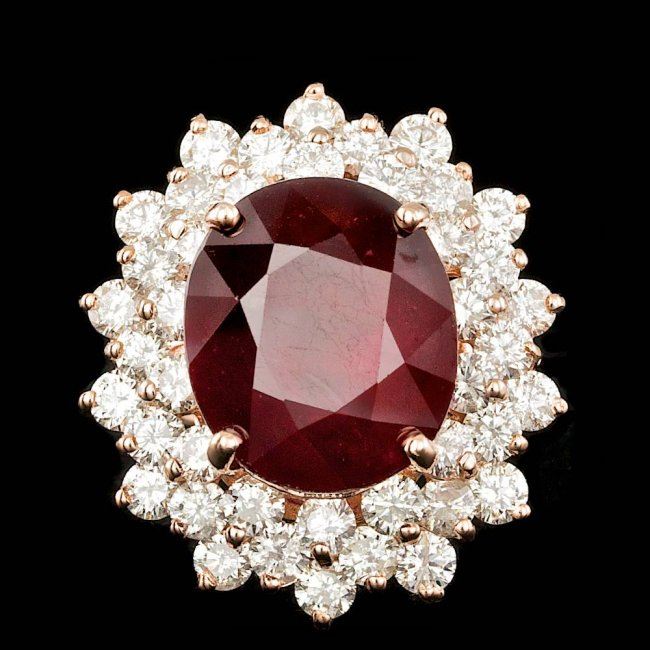 Retail: $22,890.00 ****** 14k Rose Gold 13.00ct Ruby 3.20ct Diamond Ring ****** Metal: 14k Solid Rose Gold / Size: 7 / Total Item Weight: 10.5 grams / Country Made: United States / / Main Stone: Ruby / Color: Red / Carat Total Weight: 13.00 / Treatment: Filling / Clarity: Type 2 / Cut: Very Good / / Secondary Stone: Diamond / Carat Total Weight: 3.20 / Treatment: None / Color Grade: G - H / Clarity: SI1 - SI2 / Cut: Very Good /