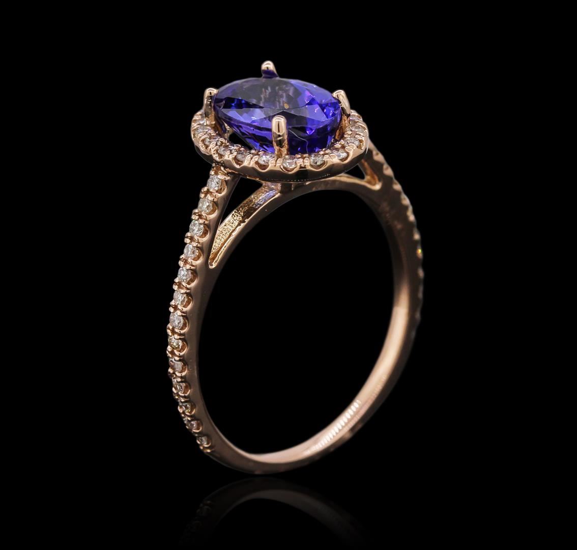 One electronically tested 14k rose gold ladies cast tanzanite and diamond ring with a cathedral shank with a bright polish finish. Identified with markings of "14K". Condition is new. Containing: One prong set oval modified brilliant cut natural tanzanite, measuring 9.02 x 6.42 x 4.17mm, approximate weight of 2.03ct., clarity is eye clean, type II, medium, moderately strong, violetish blue color, (GIA vB 5/4), cut is good. Forty-Six prong set round brilliant cut diamonds, measuring 1.10 - 1.10 x 0.66mm (depth est.) approximate total weight of 46 Stones = 0.22ct. Clarity: SI-2 to I-1. Color: I - J, Cut is Good. Diamonds and colored gemstones are graded in the mounting, unless otherwise stated. Colored gemstones are presumed to have been subjected to commonly used enhancement processes. Total Weight of Colored Stones 2.03ct. Total Weight of Diamonds 0.22ct. Total Weight of Ring 2.90 grams. GGL Appraised at $2,410.00.