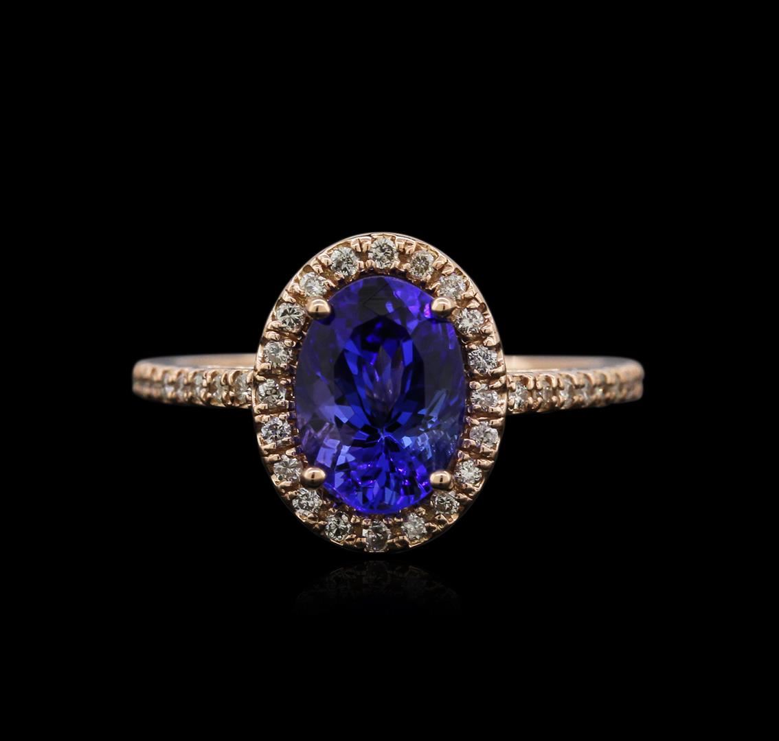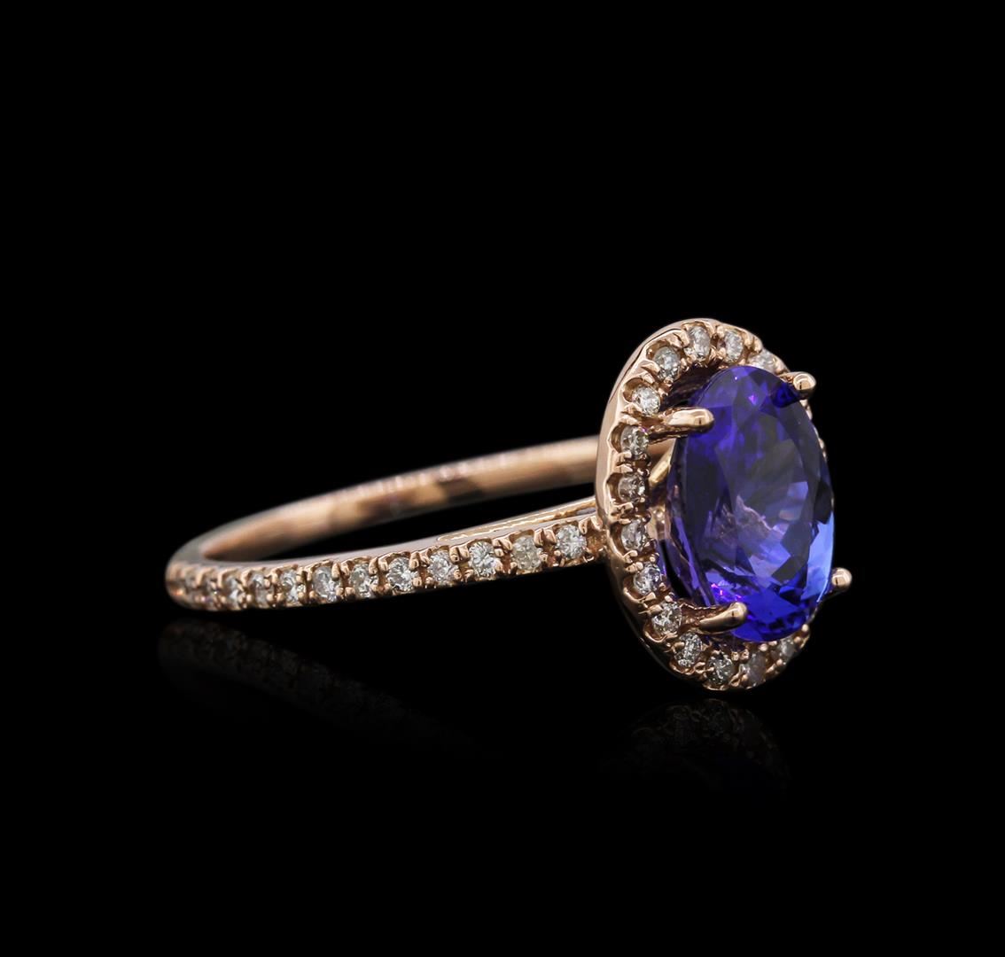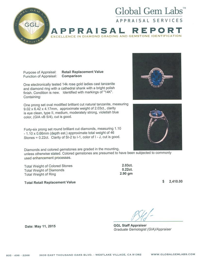 One electronically tested 14k rose gold ladies cast tanzanite and diamond ring with a cathedral shank with a bright polish finish. Identified with markings of "14K". Condition is new. Containing: One prong set oval modified brilliant cut natural tanzanite, measuring 9.02 x 6.42 x 4.17mm, approximate weight of 2.03ct., clarity is eye clean, type II, medium, moderately strong, violetish blue color, (GIA vB 5/4), cut is good. Forty-Six prong set round brilliant cut diamonds, measuring 1.10 - 1.10 x 0.66mm (depth est.) approximate total weight of 46 Stones = 0.22ct. Clarity: SI-2 to I-1. Color: I - J, Cut is Good. Diamonds and colored gemstones are graded in the mounting, unless otherwise stated. Colored gemstones are presumed to have been subjected to commonly used enhancement processes. Total Weight of Colored Stones 2.03ct. Total Weight of Diamonds 0.22ct. Total Weight of Ring 2.90 grams. GGL Appraised at $2,410.00.