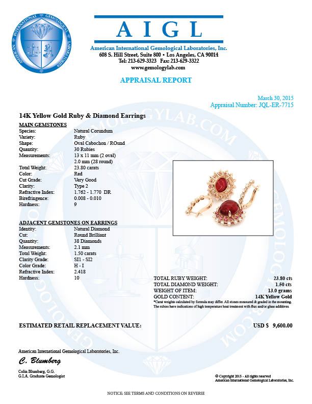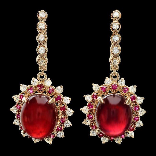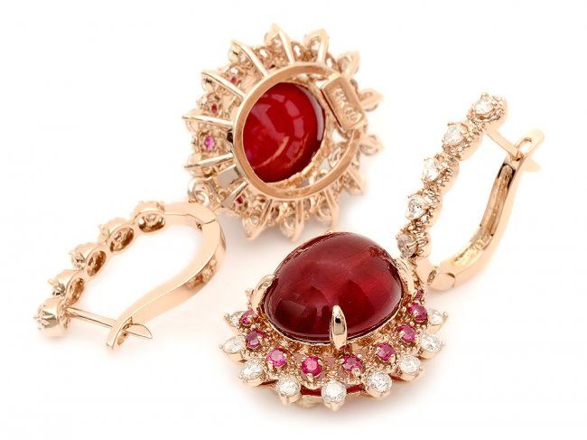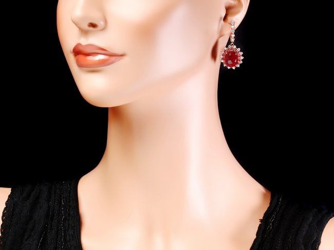 Retail: $9,600.00 ****** 14k Rose Gold 23.8ct Ruby 1.50ct Diamond Earrings ****** Metal: 14k Solid Rose Gold / Total Item Weight: 13.0 grams / Country Made: United States / / Main Stone: Ruby / Color: Red / Carat Total Weight: 23.00 / Treatment: Filling / Clarity: Type 2 / Cut: Very Good / / Secondary Stone: Diamond / Carat Total Weight: 1.50 / Treatment: None / Color Grade: H - I / Clarity: SI1 - SI2 / Cut: Very Good / / Side Stone: Ruby / Color: Multi-Colored / Carat Total Weight: 0.80 / Treatment: Diffusion / Clarity: Type 2 / Cut: Very Good /