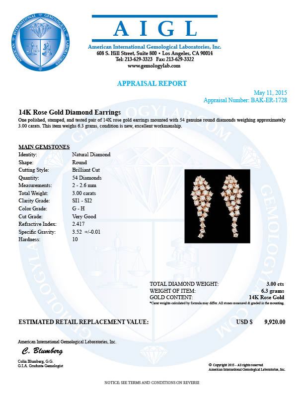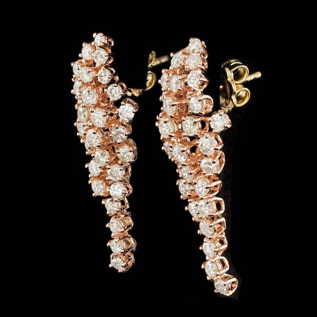 Retail: $9,800.00 ****** 14k Rose Gold 3.00ct Diamond Earrings ****** Metal: 14k Solid Rose Gold / Total Item Weight: 6.3 grams / Country Made: United States / / Main Stone: Diamond / Color: White / Carat Total Weight: 3.00 / Treatment: None / Color Grade: G - H / Clarity: SI1 - SI2 / Cut: Very Good /