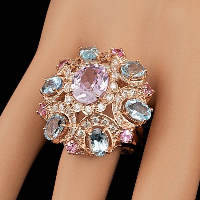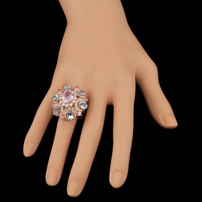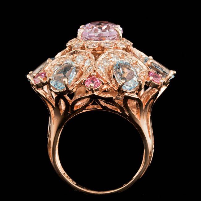 Retail: $21,600.00 ****** 14k Rose Gold 3.50ct Kunzite 1.25ct Diamond Ring ****** Metal: 14k Solid Rose Gold / Size: 7 / Total Item Weight: 14.5 grams / Country Made: United States / / Main Stone: Kunzite / Color: Pink / Carat Total Weight: 3.50 / Treatment: None / Clarity: Type 2 / Cut: Very Good / / Secondary Stone: Diamond / Carat Total Weight: 1.25 / Treatment: None / Color Grade: G - H / Clarity: SI1 - SI2 / Cut: Very Good / / Side Stone: Aquamarine, Sapphire / Color: Aqua, Pink / Carat Total Weight: 5.00 / Treatment: None /
