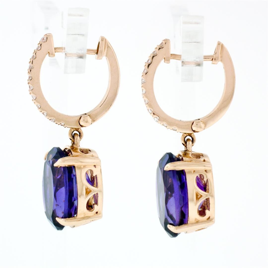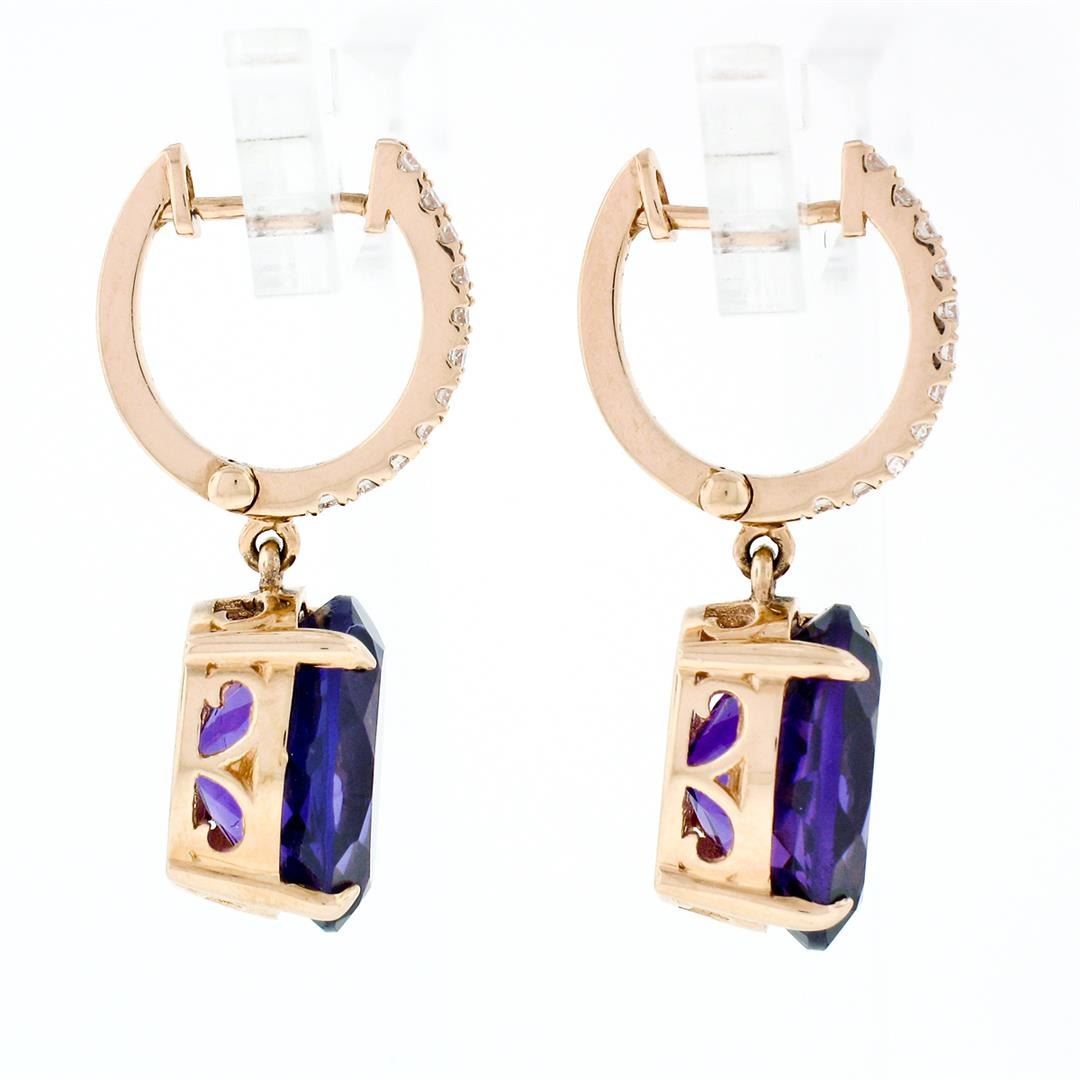An estate solid 14k rose gold drop dangle earrings, with 2 oval cut natural amethysts (8.2ctw), and 22 round brilliant cut natural diamonds (G/H - VS1/VS2 ; 0.25ctw). The earrings measure approximately 27.13x10.16mm and weigh a total of 5.72 grams.