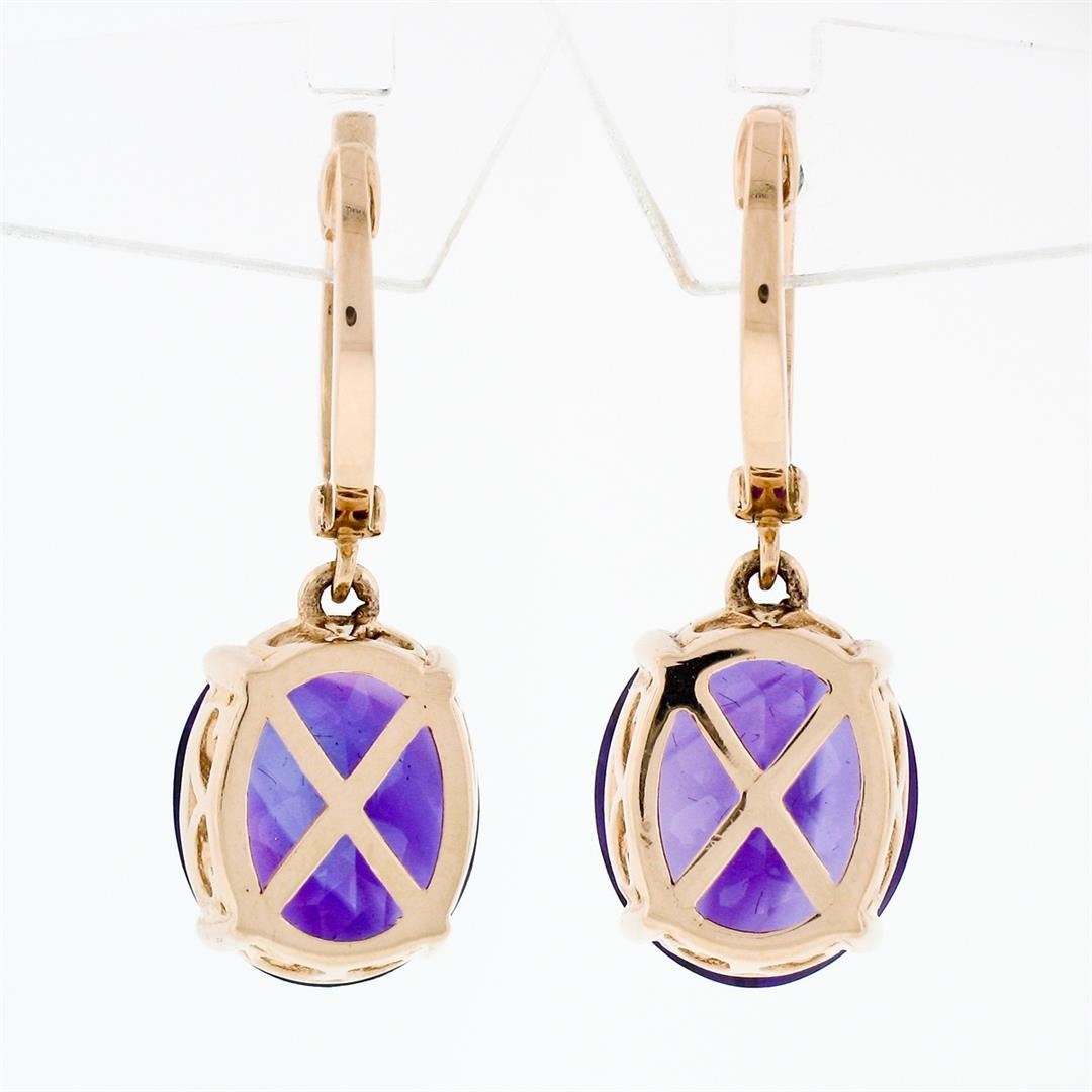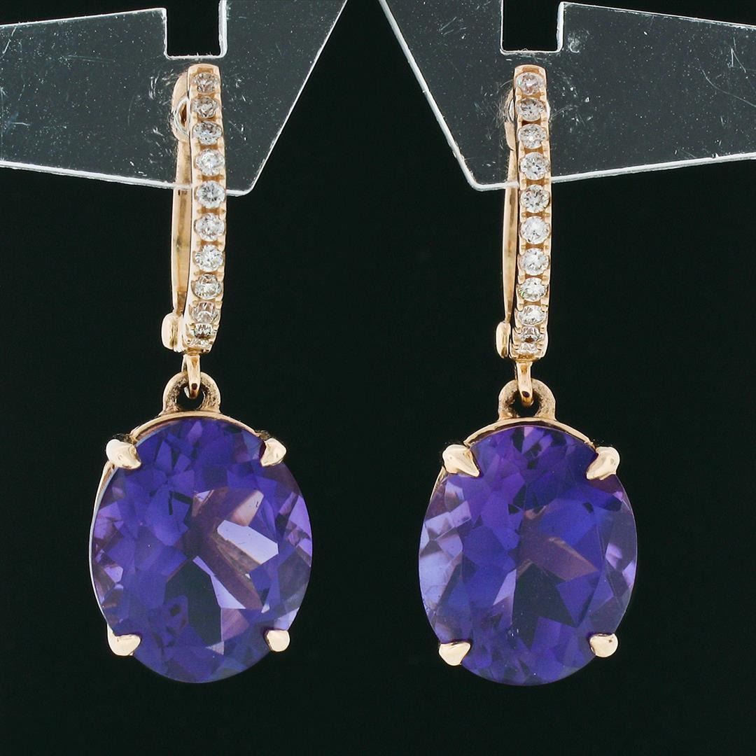 An estate solid 14k rose gold drop dangle earrings, with 2 oval cut natural amethysts (8.2ctw), and 22 round brilliant cut natural diamonds (G/H - VS1/VS2 ; 0.25ctw). The earrings measure approximately 27.13x10.16mm and weigh a total of 5.72 grams.
