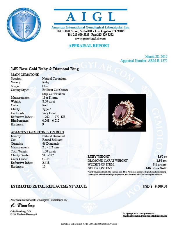Retail: $9,600.00 ****** 14k Rose Gold 8.50ct Ruby 1.50ct Diamond Ring ****** Metal: 14k Solid Rose Gold / Size: 6.75 / Total Item Weight: 8.10 grams / Country Made: United States / / Main Stone: Ruby / Color: Red / Carat Total Weight: 8.50 / Treatment: Filling / Clarity: Type 2 / Cut: Very Good / / Secondary Stone: Diamond / Carat Total Weight: 1.50 / Treatment: None / Color Grade: G - H / Clarity: SI1 - SI2 / Cut: Very Good /