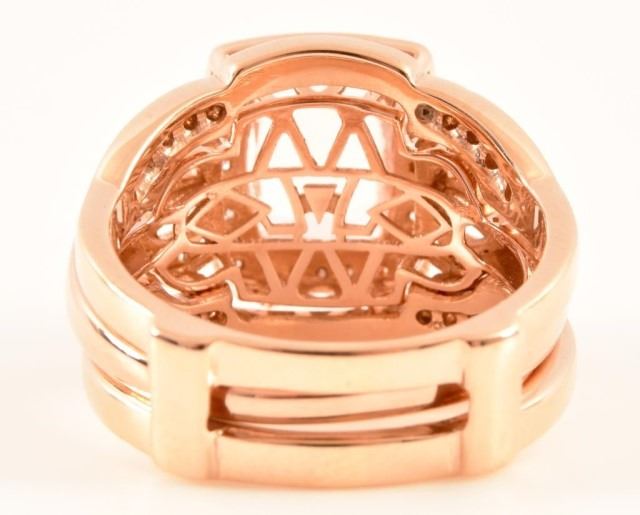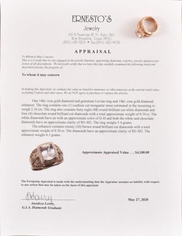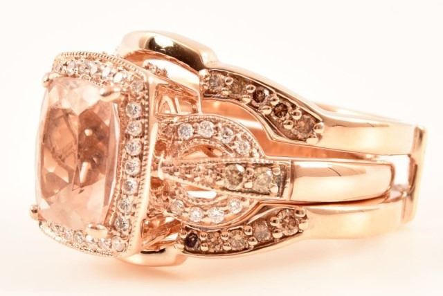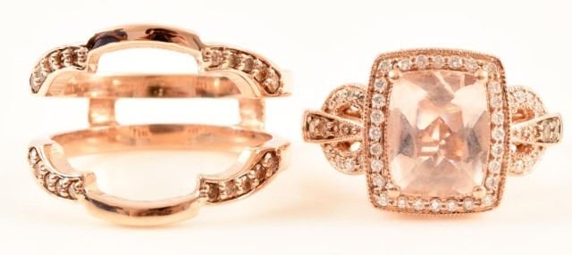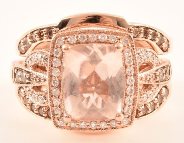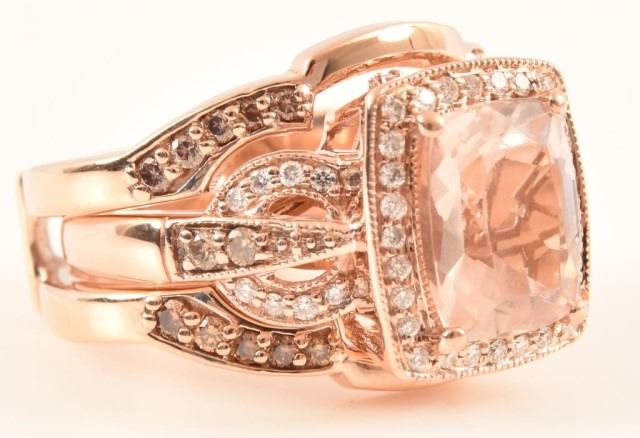 *With Appraisal. Approximate Appraisal Value: $4,100. One 14kt rose gold diamond and gemstone Levian ring and 14kt rose gold enhancer. The ring contains one (1) cushion cut morganite stone estimated in the mounting to weigh 2.16 cts. The ring also contains forty-eight (48) round brilliant cut white diamonds and four (4) chocolate round brilliant cut diamonds with a total approximate weight of 0.34 ct. The white diamonds have an approximate color of G-H and both the white and chocolate diamonds have an approximate clarity of SI1-SI2. The ring weighs 5.4 grams. The enhancer contains twenty (20) brown round brilliant cut diamonds with a total approximate weight of 0.30 ct. The diamonds have an approximate clarity of SI1-SI2. The enhancer weighs 6.3 grams.