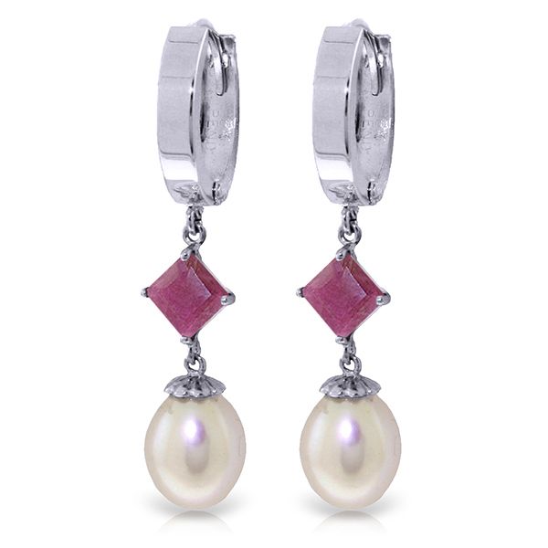 14K. GOLD HOOP EARRING W/ NATURAL PEARLS & RUBIES