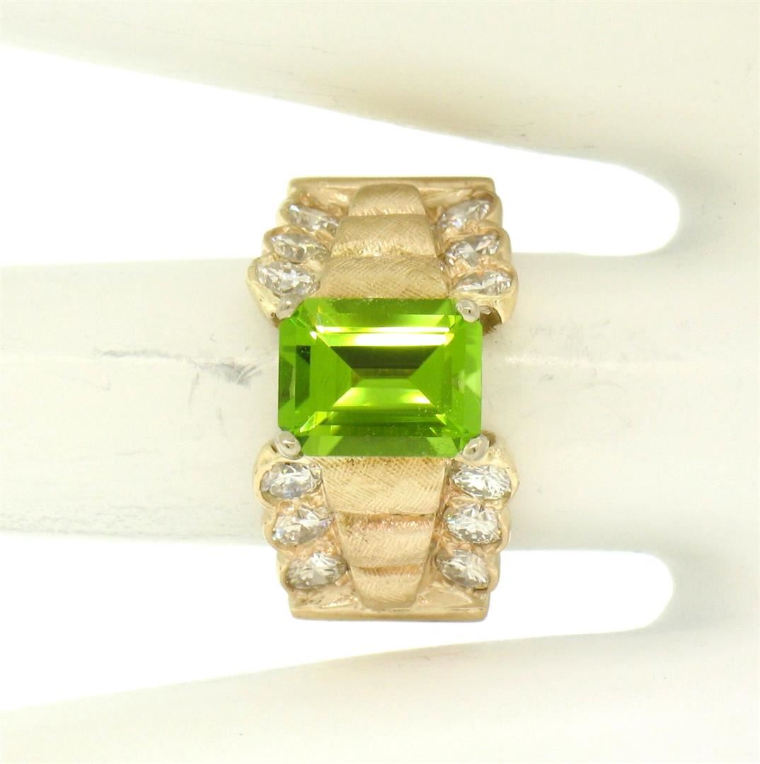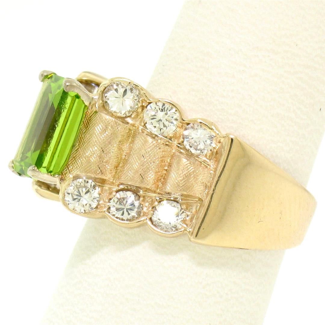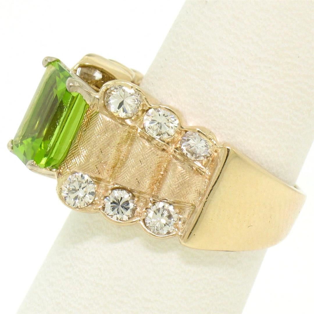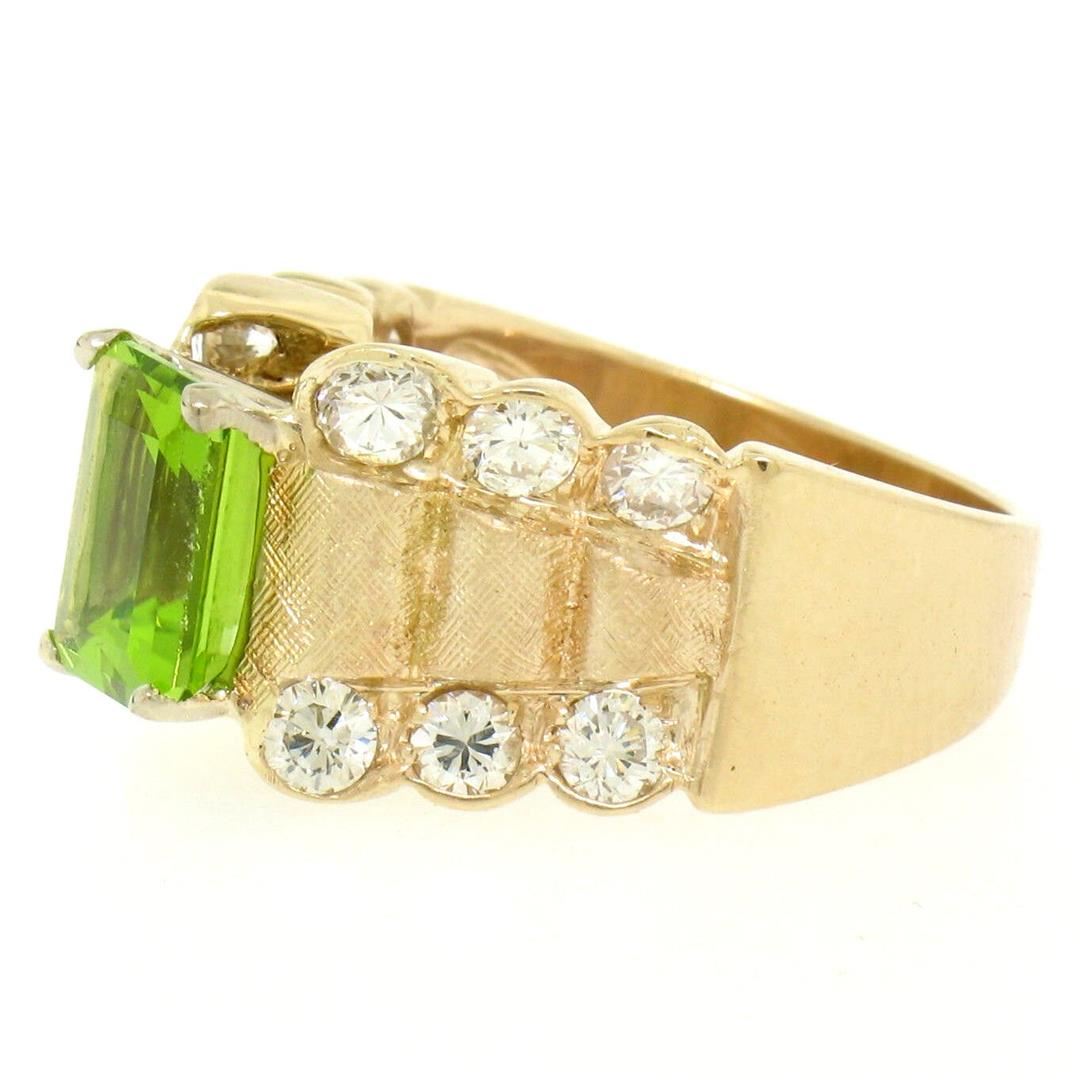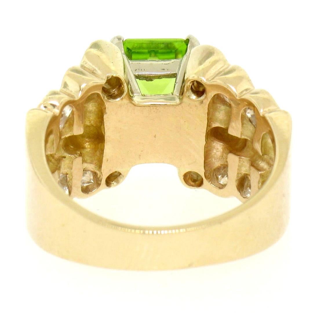 An estate solid 14k yellow gold cocktail ring, with 1 emerlad cut natural peridot (8.8x6.9mm - 2.27ct), and 12 round brilliant cut natural diamonds (F/G- VS1/VS2; 1.40ctw). The ring is size 6.0, weighs a total of 9.80 grams, and measures 12mm wide.