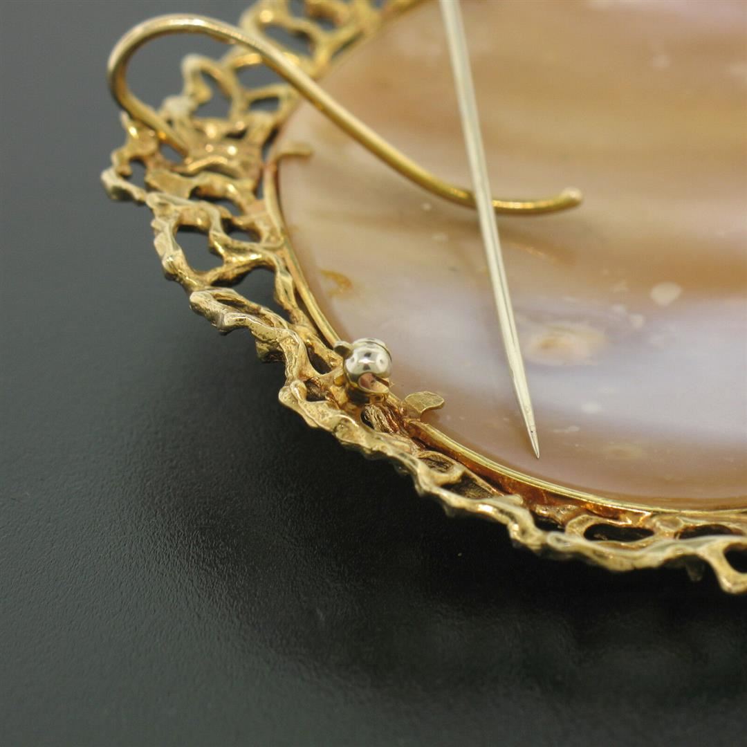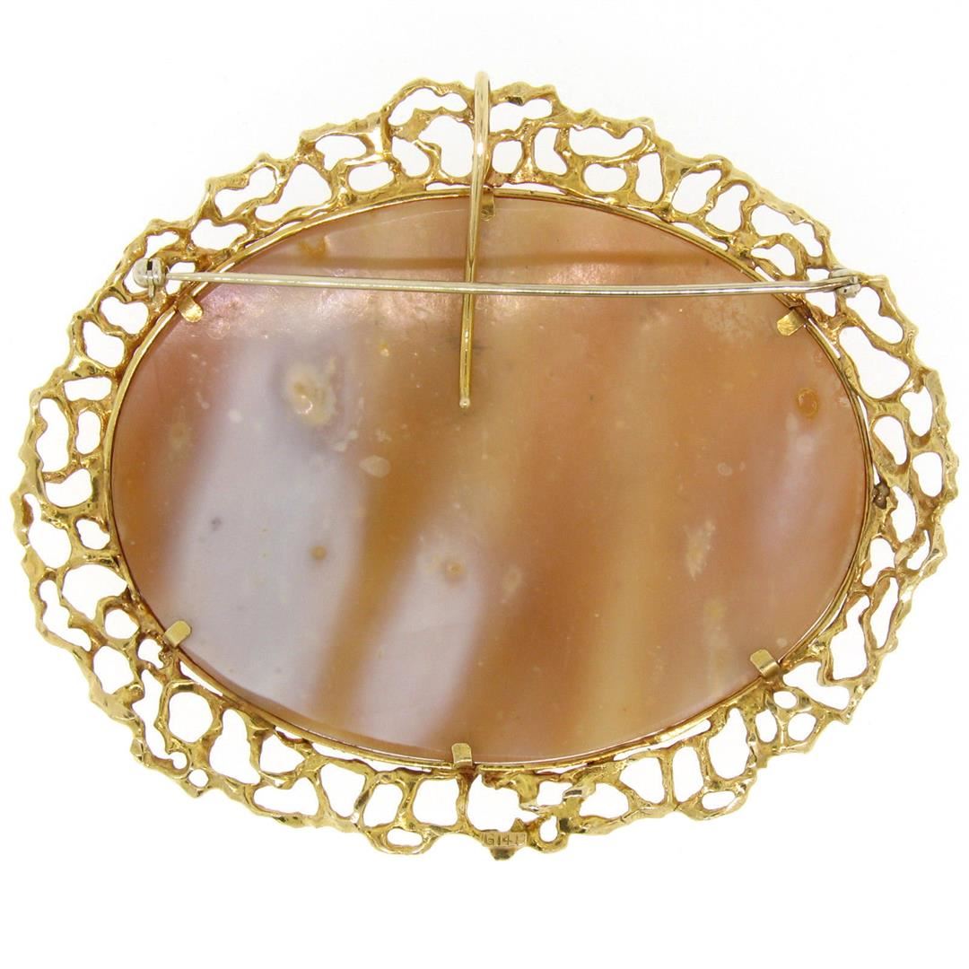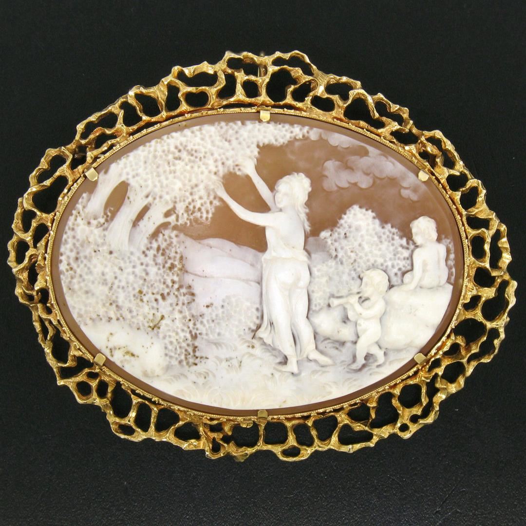 One Vintage 14k Solid Gold HUGE LARGE Carved Shell Open Nugget Cameo Brooch Pendant. Item Details: Material: Solid 14k Yellow Gold, Total Weight: 51.4 Grams Total, Stone(s): (1) Carved Shell Cameo - Oval Shape - 70.0x50.0mm [2.76x1.97"] (approx.), Overall Height: 71.3mm (2.85"), Overall Width: 88.0mm (3.52"), Condition: Vintage piece. Polished finish, very little patina. Excellent condition!