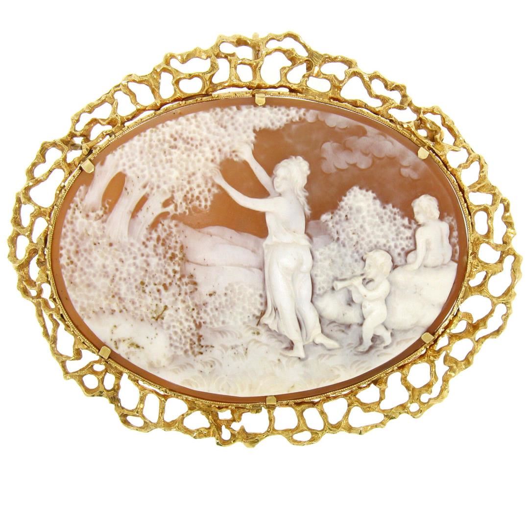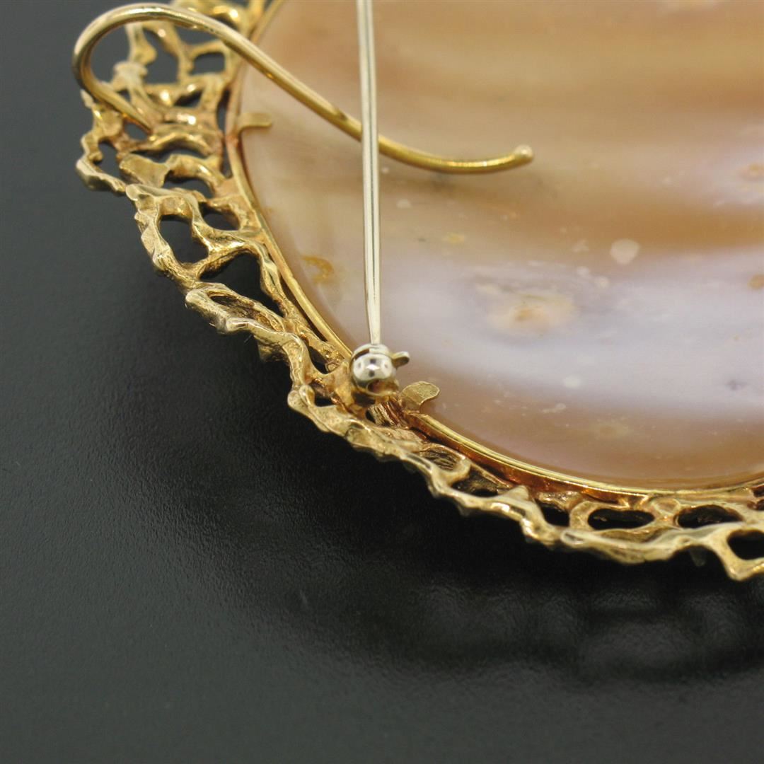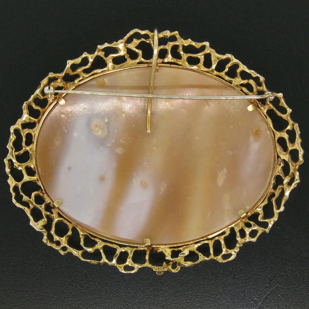 One Vintage 14k Solid Gold HUGE LARGE Carved Shell Open Nugget Cameo Brooch Pendant. Item Details: Material: Solid 14k Yellow Gold, Total Weight: 51.4 Grams Total, Stone(s): (1) Carved Shell Cameo - Oval Shape - 70.0x50.0mm [2.76x1.97"] (approx.), Overall Height: 71.3mm (2.85"), Overall Width: 88.0mm (3.52"), Condition: Vintage piece. Polished finish, very little patina. Excellent condition!