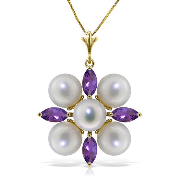 A brilliant style of 14K Solid Gold Necklace matched with 5 round shaped natural Pearls along with 4 marquis shaped Natural Amethysts in between.