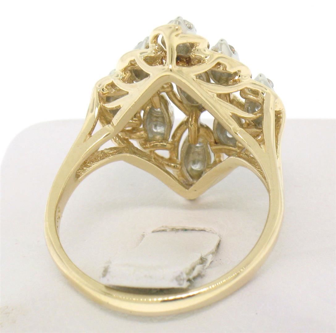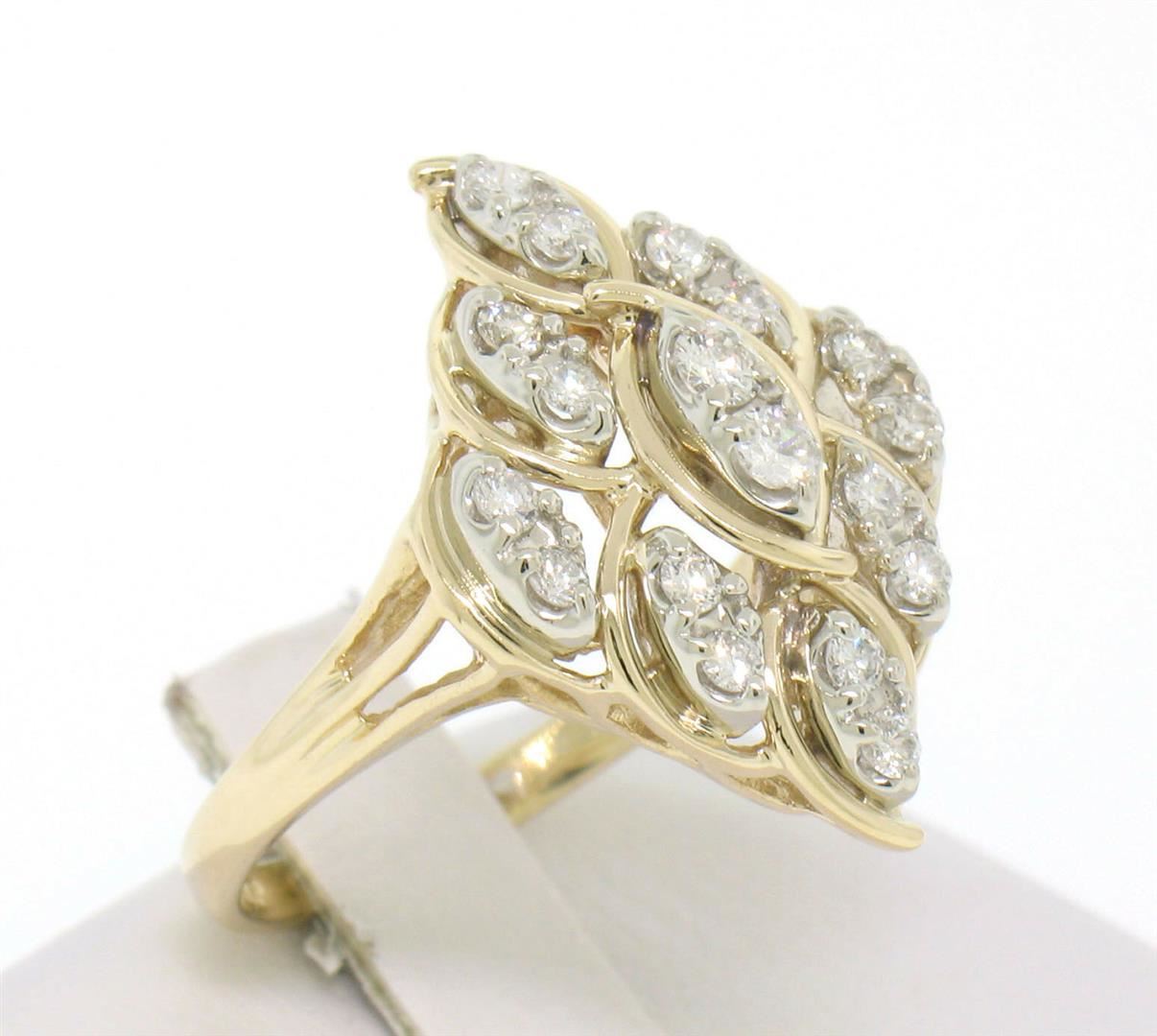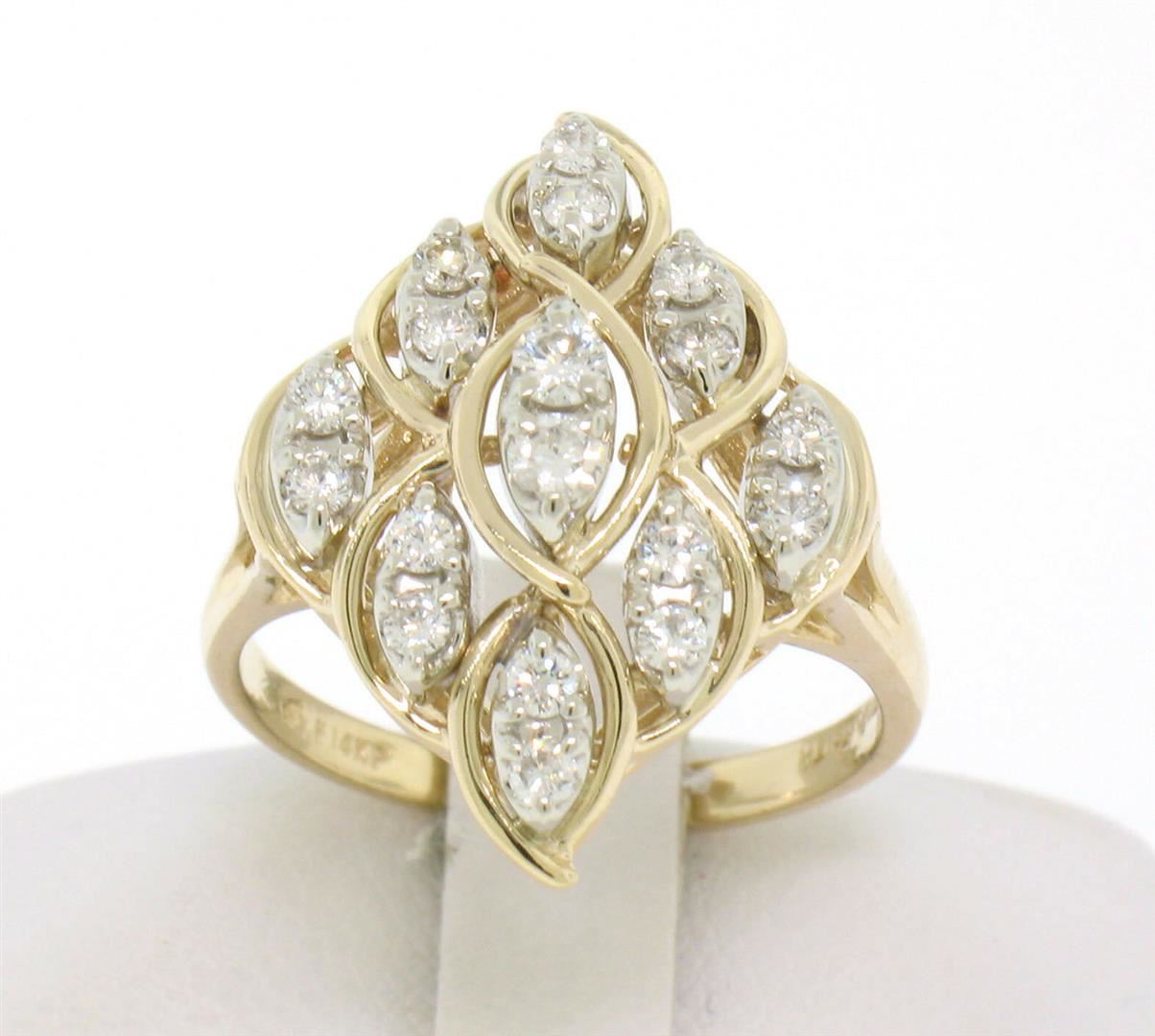 One 14K Solid Yellow Gold Marquise Shaped Diamond Dinner Ring with Floating Diamond Settings. Item Details: Material: 14K Solid Yellow Gold, Weight: 4.80 Grams, Stone: (18) Natural Genuine Round White Diamonds - F/G Color - VS2/SI1 Clarity - 0.60ctw, Size: 6.5, Width: 22.00mm, Condition: Estate - Like New!