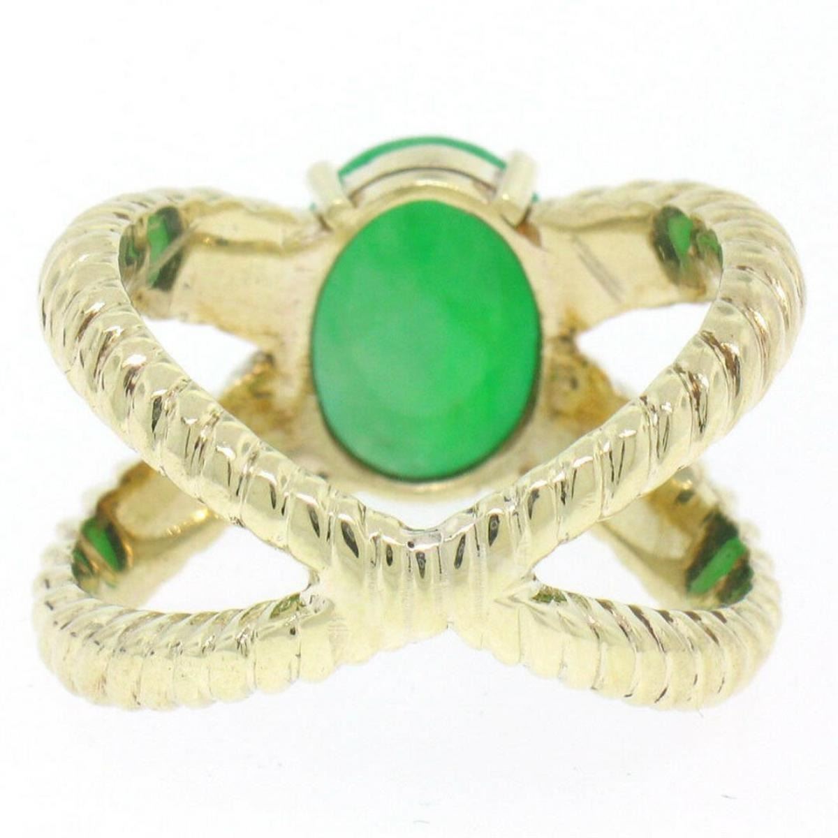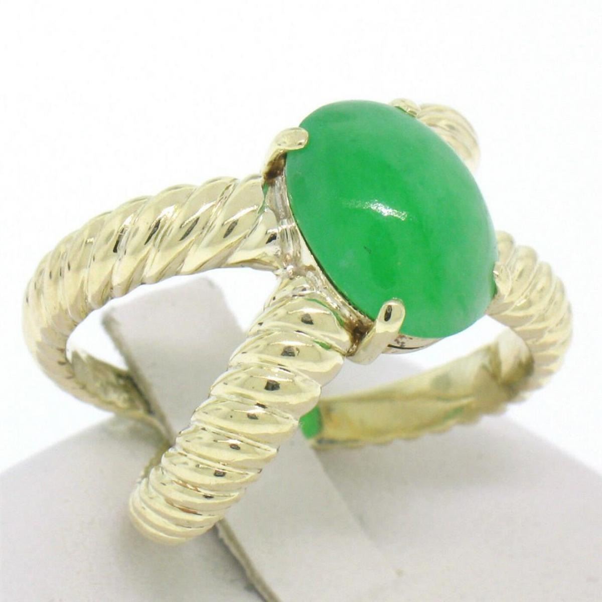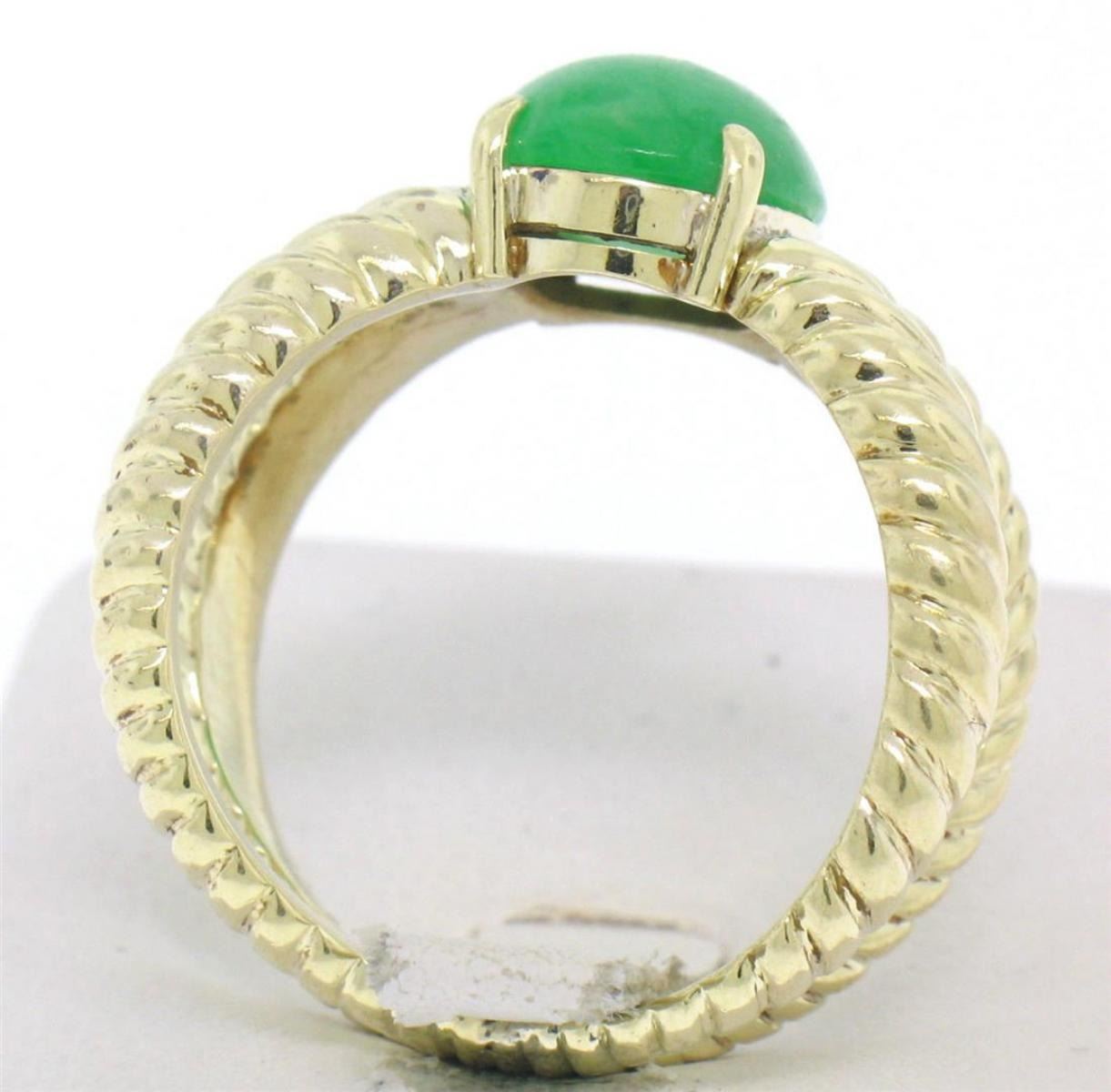 One 14K Solid Yellow Gold Cabochon Grass Green Jade Ring with Intersecting Spiral Ribbed Bands. Item Details: Material: 14K Solid Yellow Gold, Weight: 10.50 Grams , Stone: (1) Natural Genuine Jade - Oval Cabochon Cut - Prong Set - 11.50mmx8.80mm - Brilliant Grass Green Color, Width: 11.82mm, Size: 6.75, Condition: Estate - Like New!
