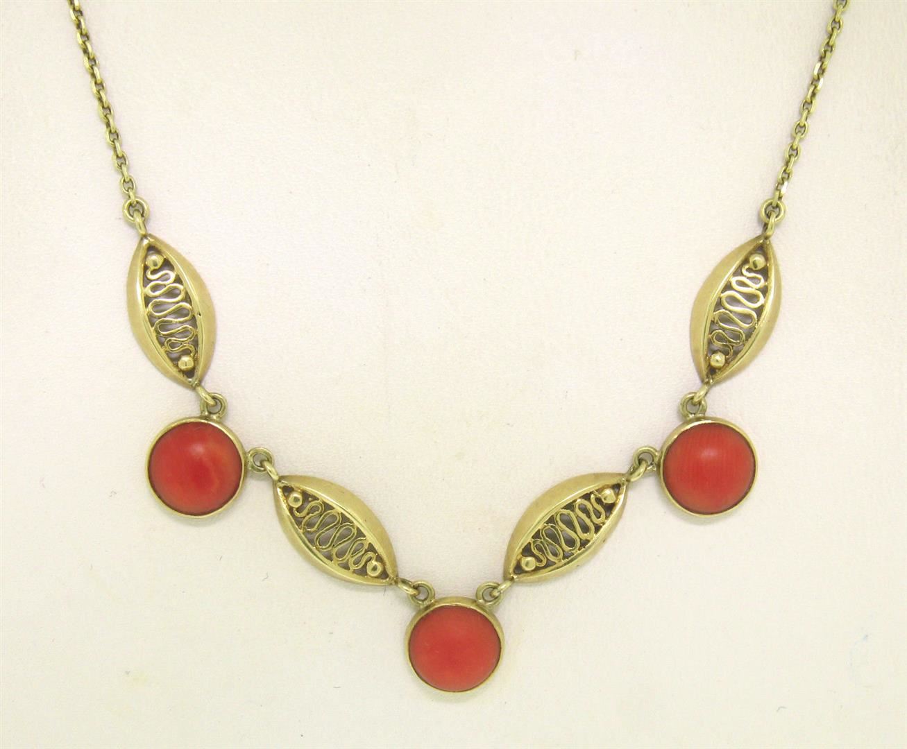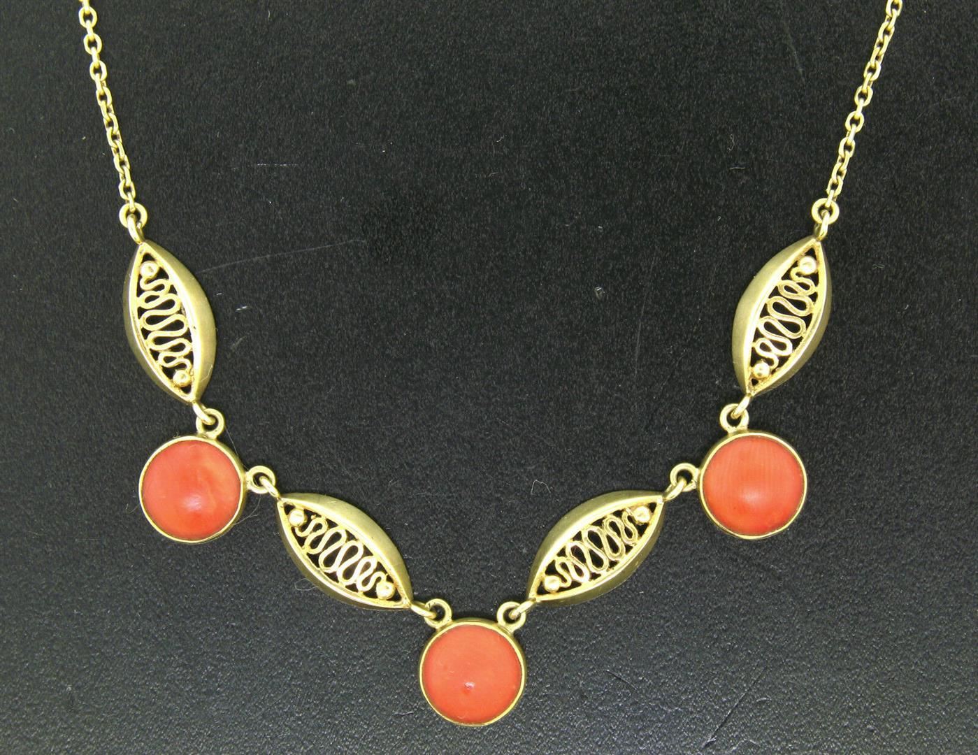 One Vintage 1950's 14k Solid Gold Ox Blood Coral Open Work Collar Necklace Chain. Item Details: Material: Solid 14k Yellow Gold, Weight: 7.30 Grams, Stone(s): (3) Natural Genuine Coral - Round Cabochon Cut - Bezel Set - Rich Ox Blood Red Color - 9.0mm (approx.), Chain Type: Cable Link, Necklace Length: 17 Inches wearable length - Center design measures 3.75 inches wide., Clasp: Spring Ring, Condition: Vintage piece. Excellent condition! Original Patina.