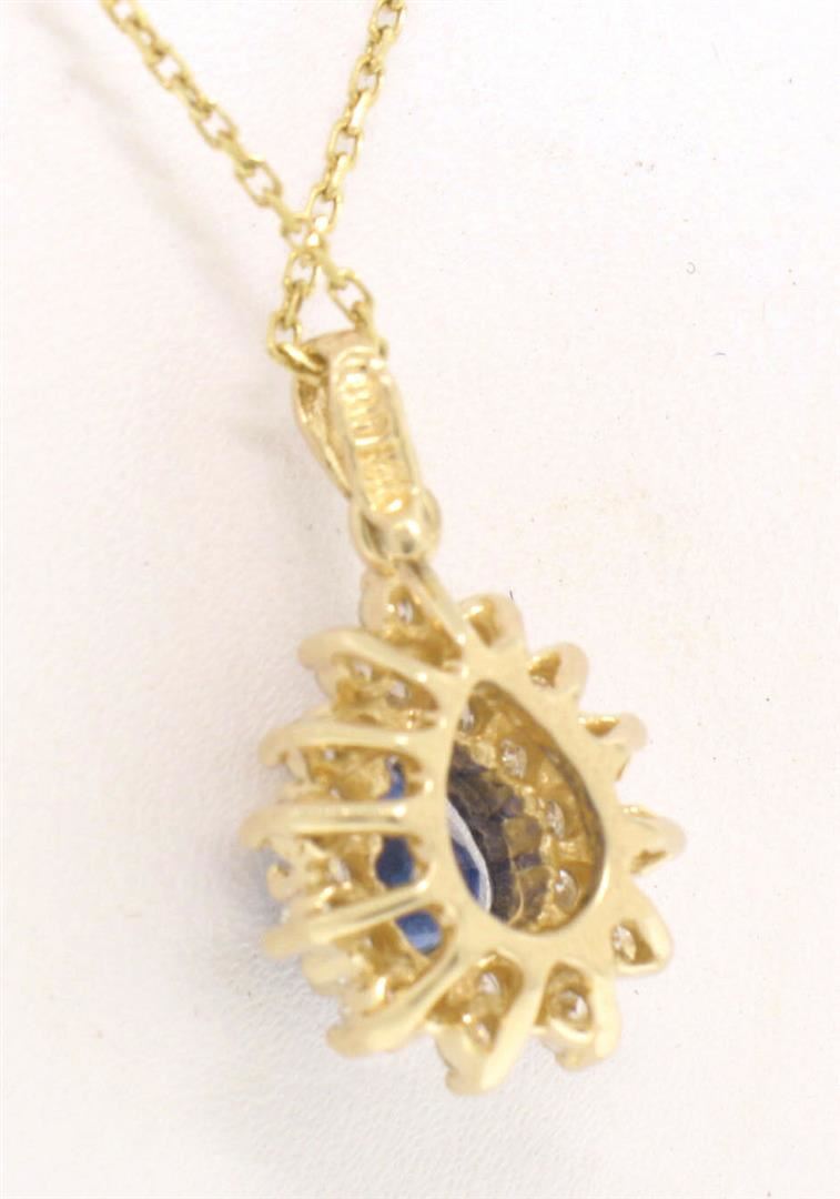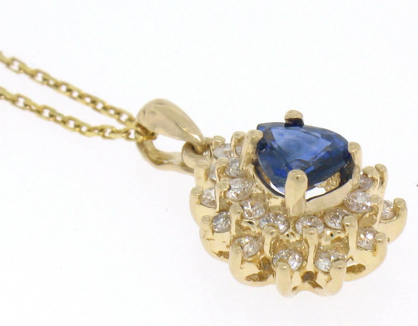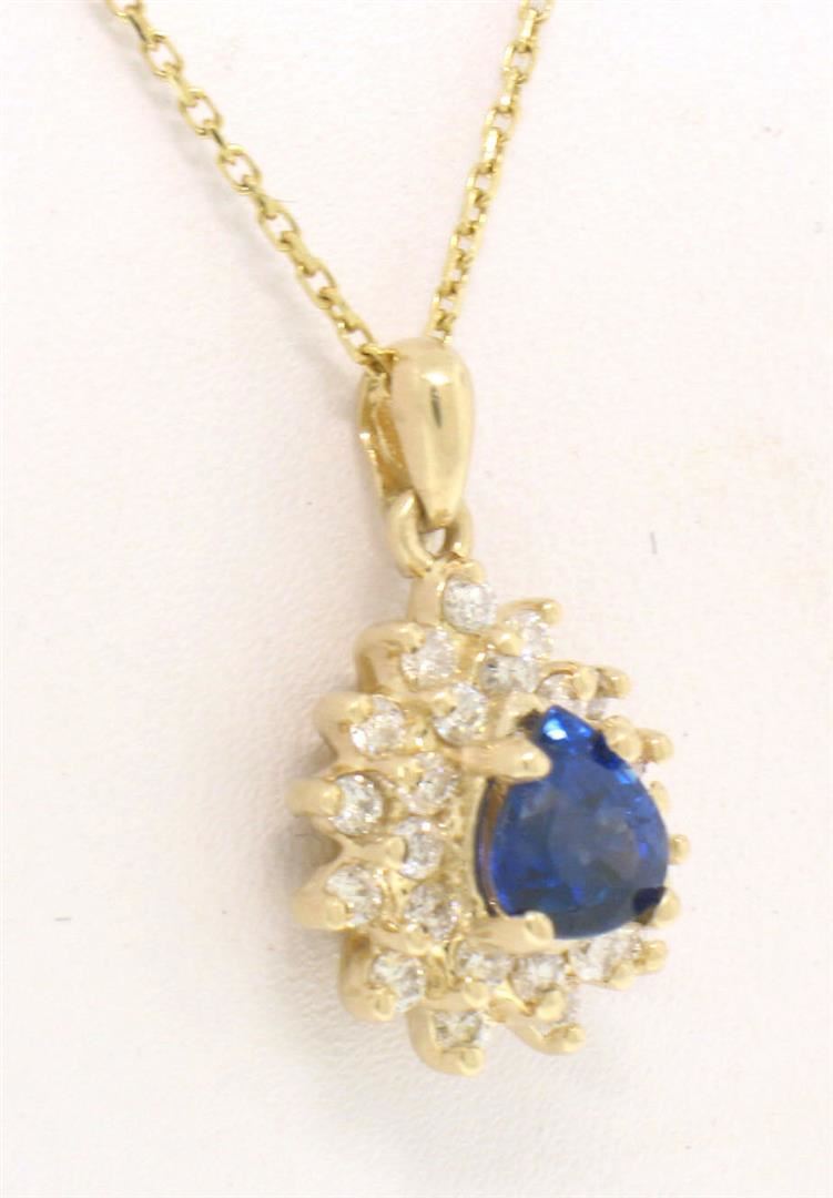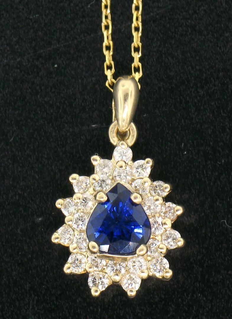 One 14k Yellow Gold 1.20ctw Pear Cut Sapphire Pendant w/ Double Round Diamond Halo. Item Details: Material: 14k Solid Yellow Gold, Weight: 3.20 Grams, Stones: (1) Natural Genuine Sapphire - Pear Brilliant Cut - Prong Set - Rich Royal Blue Color - 5.80x5.30mm - 0.80ctw (approx.), (25) Natural Genuine Diamonds - Round Brilliant Cut - Prong Set - G/H Color - VS2 Clarity - 0.40ctw (approx.), Dimensions (With Bail): 19.0x12.5mm, Chain: Cable link chain with lobster claw clasp. 16 Inches long, Condition: Like New,